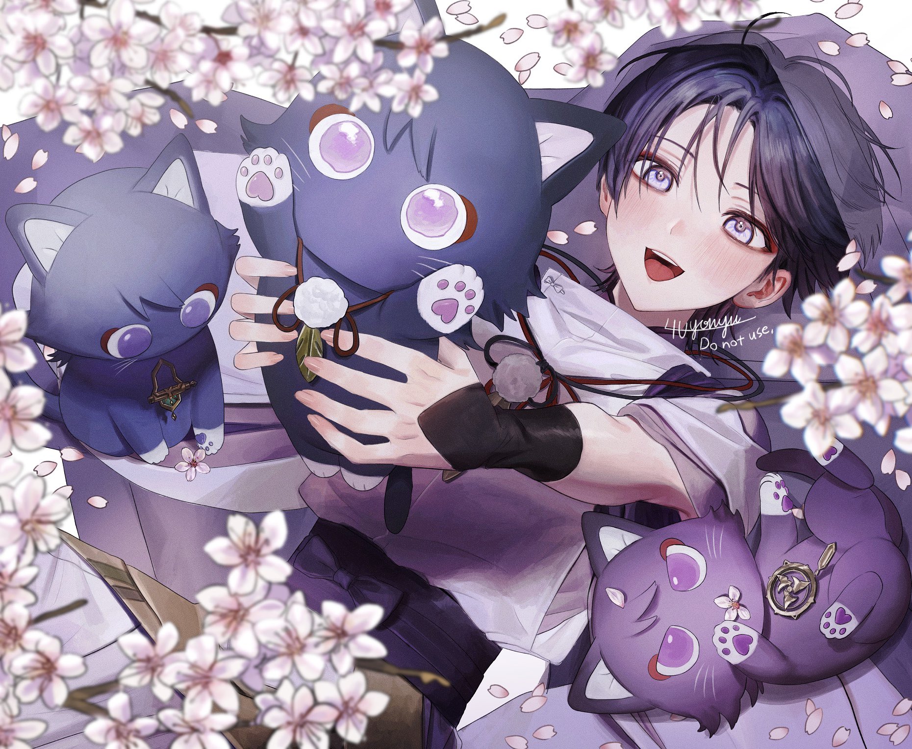 1boy 4the2ofus animal animalization armor artist_name black_bow black_cat black_hair black_sash bow cat cherry_blossoms choppy_bangs clothing_cutout commentary_request cursive dutch_angle eyeliner feathers fingernails from_above genshin_impact grey_eyes highres holding holding_animal holding_cat japanese_armor japanese_clothes kariginu kimono kote kurokote layered_sleeves light_blush looking_at_animal looking_up lying makeup male_focus on_back open_mouth person_and_animalization petals petals_on_ground pink_nails pink_petals pom_pom_(clothes) purple_cat purple_kimono purple_sleeves red_eyeliner sash scaramouche_(cat)_(genshin_impact) scaramouche_(genshin_impact) scaramouche_(kabukimono)_(genshin_impact) short_sleeves side_cutout signature solo string teeth tongue tsurime upper_teeth_only white_background white_sleeves yellow_feathers