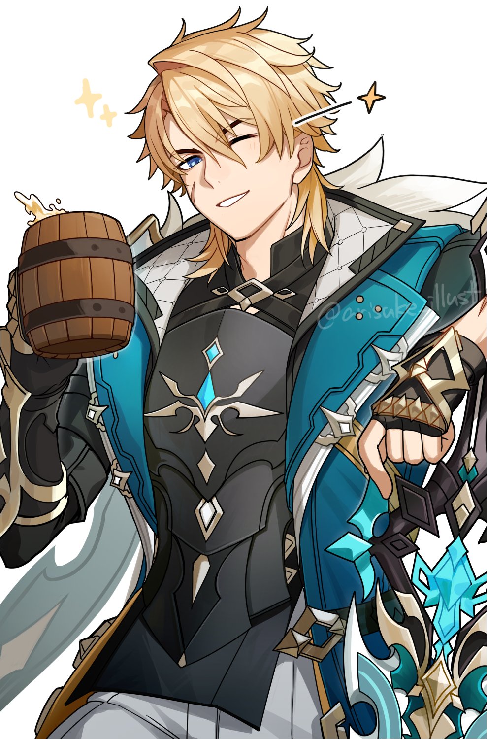1boy arisuke_(natuyan) armor artist_name beer_mug blonde_hair coat commentary_request cup genshin_impact green_coat grin highres holding holding_cup leaning_on_weapon looking_at_viewer male_focus mug one_eye_closed scar scar_on_face smile sparkle twitter_username varka_(genshin_impact) watermark white_background