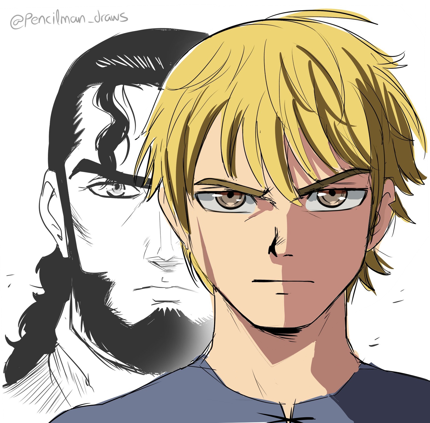 2boys artist_name beard blonde_hair facial_hair father_and_son full_beard highres long_beard male_focus messy_hair multiple_boys pencilman_draws signature thorfinn thors twitter_username vinland_saga
