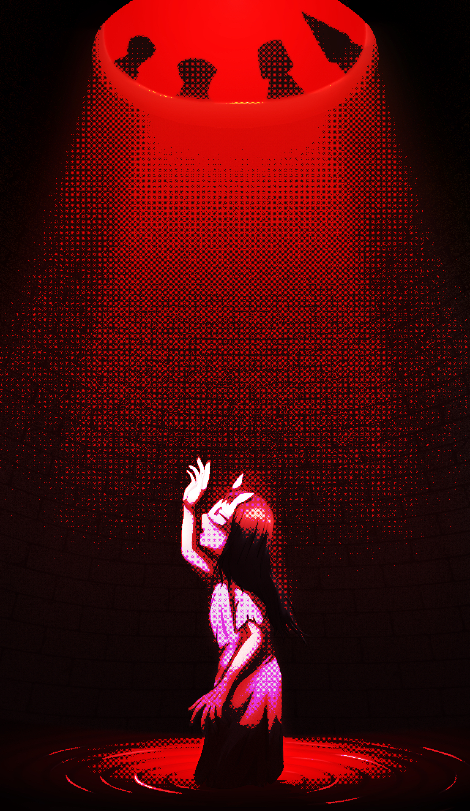 2girls 3boys absurdres bandage_(reanimal) boy_(reanimal) bucket_(reanimal) commentary dithering dress eileenakatsuki eye_mask girl_(reanimal) hand_up highres hood hood_(reanimal) mask multiple_boys multiple_girls partially_submerged rabbit_mask reanimal silhouette solo_focus well