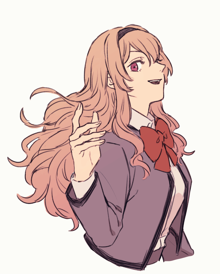 1girl :d arm_at_side black_hairband bow bowtie collared_shirt commentary cropped_torso grey_jacket hair_between_eyes hairband hand_up hiramoto_(shir_gn_9) jacket long_hair long_sleeves looking_at_viewer looking_to_the_side open_clothes open_jacket open_mouth red_bow red_bowtie saijo_claudine school_uniform seishou_music_academy_uniform shirt shoujo_kageki_revue_starlight sideways_mouth simple_background smile solo teeth upper_body upper_teeth_only wavy_hair white_background white_shirt