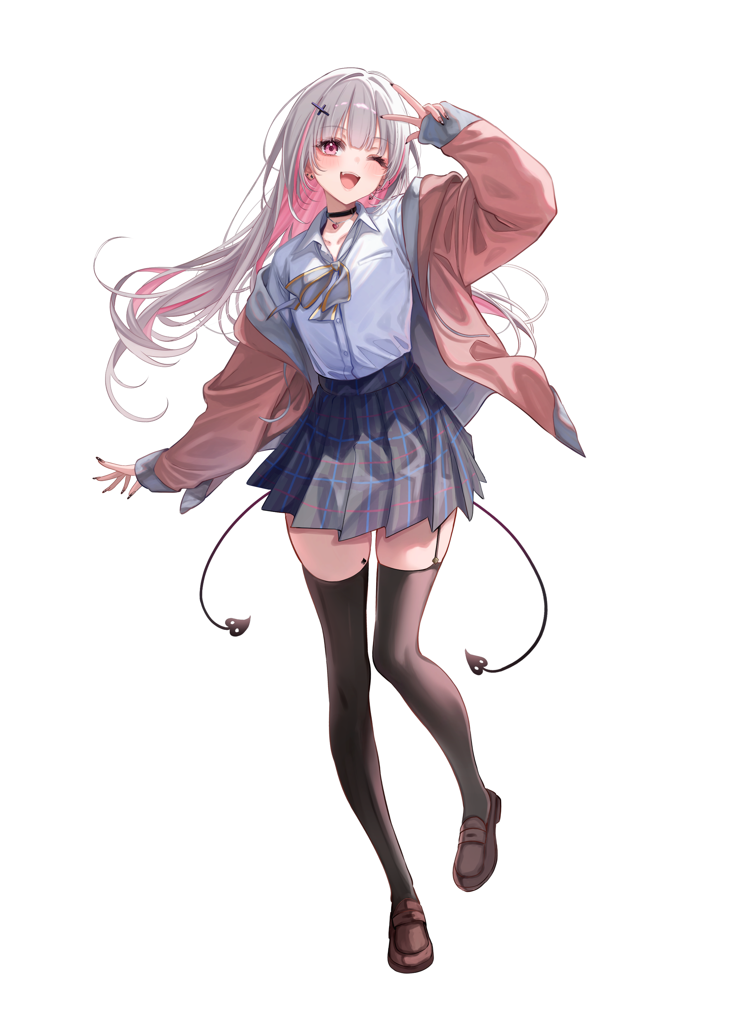 1girl absurdres asumi_sena black_thighhighs brown_shoes commentary_request cross_hair_ornament fang grey_hair hair_ornament highres jacket loafers long_hair long_sleeves looking_at_viewer multicolored_hair one_eye_closed open_clothes open_jacket open_mouth pink_eyes pink_hair sa-ya2 school_uniform shirt shoes simple_background skirt smile solo tail teeth thighhighs upper_teeth_only virtual_youtuber vspo! white_background white_shirt zettai_ryouiki