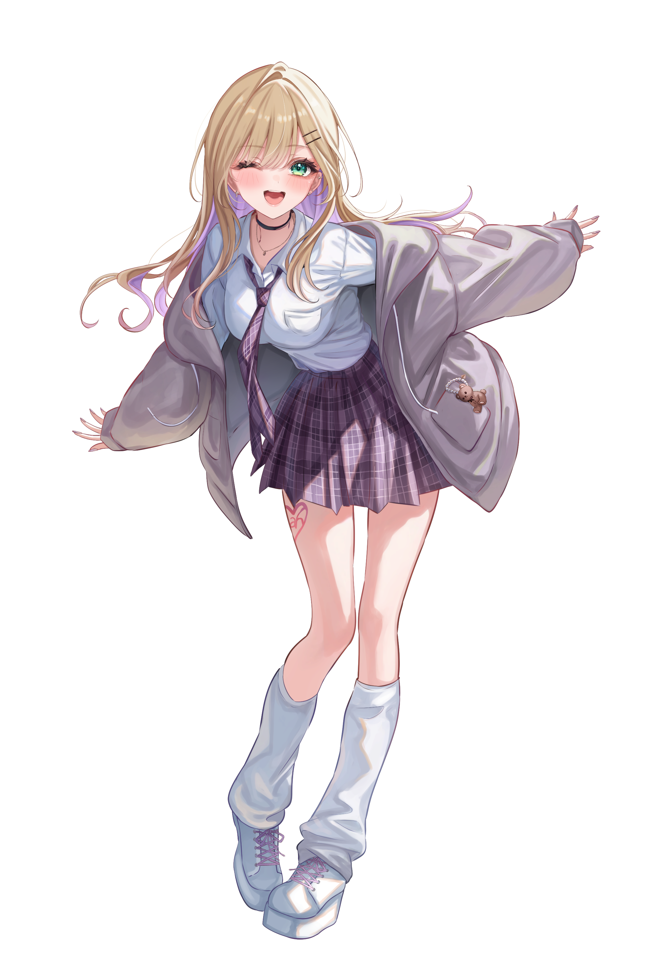 1girl absurdres black_choker blonde_hair breasts choker collared_shirt colored_inner_hair commentary_request earrings full_body green_eyes grey_jacket hair_ornament hairclip highres hood hooded_jacket jacket jewelry kurumi_noah kurumi_noah_(8th_costume) leg_warmers long_hair long_sleeves looking_at_viewer medium_breasts miniskirt multicolored_hair necklace necktie off_shoulder one_eye_closed outstretched_arms parallel_hairclips plaid_clothes plaid_necktie platform_shoes pleated_skirt purple_hair purple_necktie purple_skirt sa-ya2 school_uniform shirt shirt_tucked_in shoes skirt smile solo virtual_youtuber vspo! white_background white_leg_warmers white_shirt white_shoes