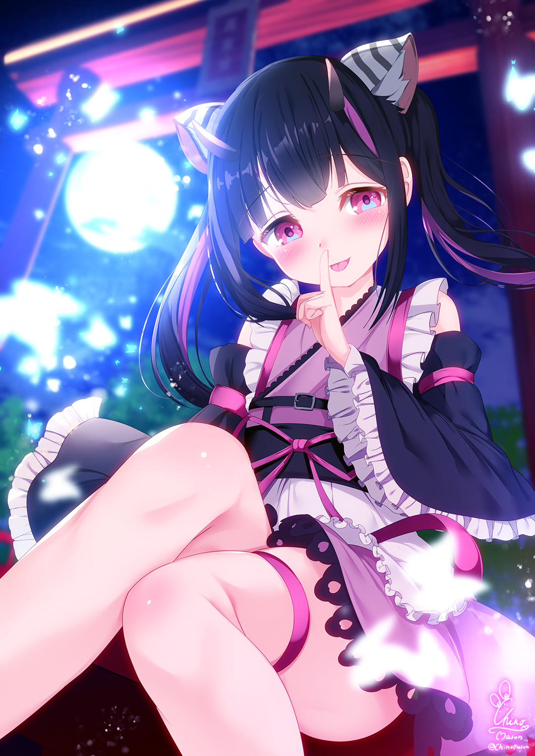1boy :p animal_ear_fluff animal_ears black_hair black_sleeves blurry blurry_background blush chinomaron cho_kaguya-hime! closed_mouth commentary_request crossdressing crossdressing_(mtf) depth_of_field detached_sleeves feet_out_of_frame frilled_sleeves frills full_moon hand_up highres horns index_finger_raised japanese_clothes kimono komazawa_noi long_hair long_sleeves moon multicolored_hair night obi purple_eyes purple_hair purple_kimono sash signature skindentation sky smile solo thigh_strap tongue tongue_out torii twintails twitter_username two-tone_hair wide_sleeves