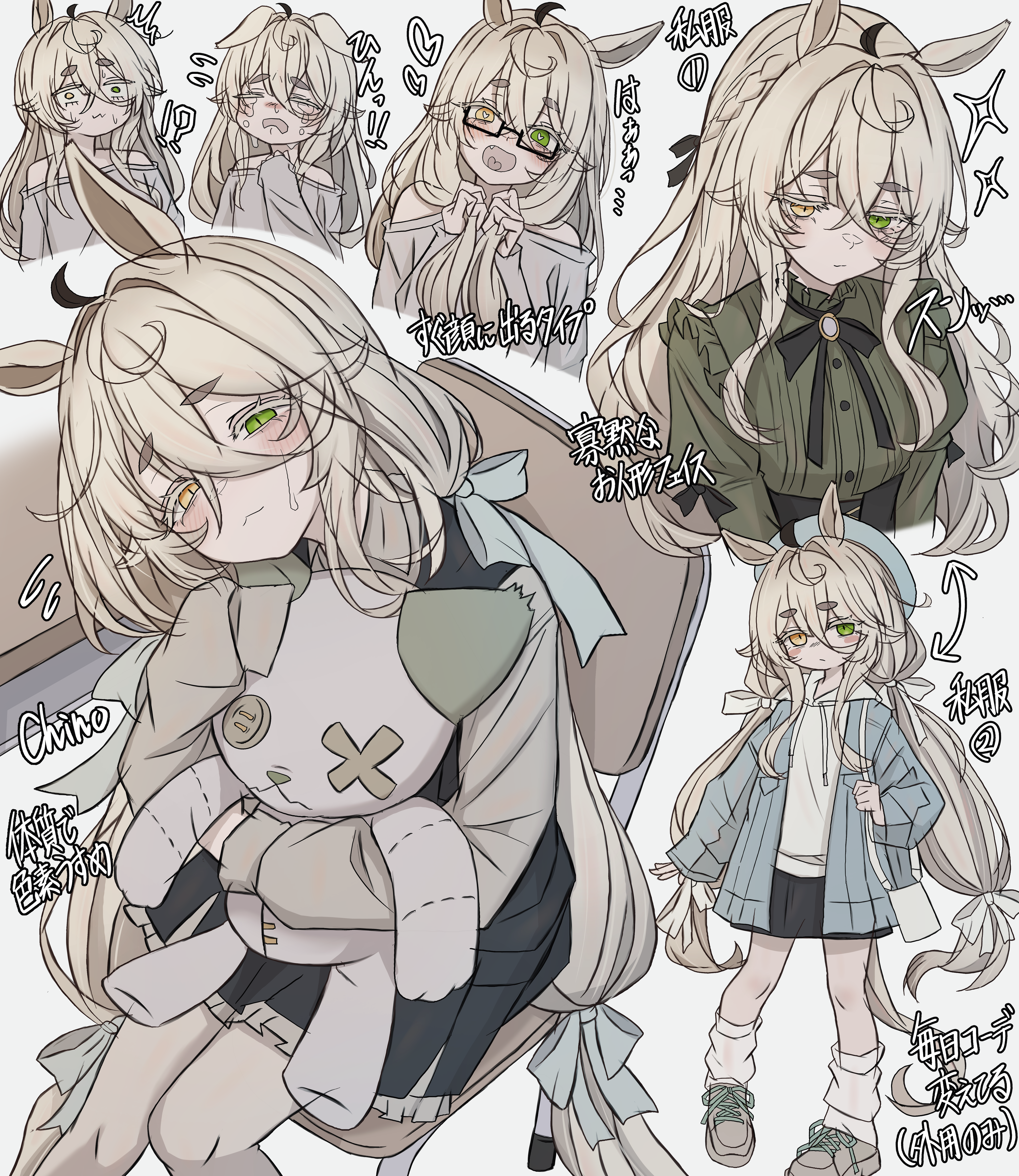 1girl absurdres animal_ears black_dress black_ribbon black_skirt blue_jacket blush braid closed_mouth commentary_request crossed_bangs crying dress frilled_shirt frills green_eyes green_shirt grey_hair grey_shirt grey_shoes hair_between_eyes heart heart_in_mouth heterochromia highres holding holding_stuffed_toy horse_ears horse_girl horse_tail jacket leg_warmers leogust long_hair off-shoulder_shirt off_shoulder open_clothes open_jacket open_mouth original ribbon shirt shoes skirt solo stuffed_animal stuffed_toy sweatdrop tail teddy_bear translation_request white_leg_warmers white_shirt yellow_eyes