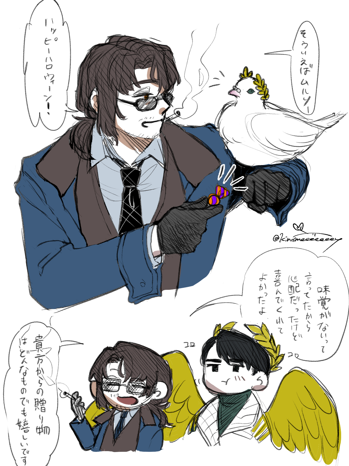 2boys :t absurdres alternate_costume angel angel_wings animal animal_on_arm beak beard_stubble between_fingers bird bird_on_arm black-framed_eyewear black-framed_glasses black_eyes black_gloves black_hair black_necktie blue_coat blush brown_eyes brown_hair brown_trim brown_vest candy chibi chibi_inset cigarette closed_eyes closed_mouth coat collared_shirt cropped_torso crown dove dress_shirt e.g.o_(project_moon) facial_hair feathered_wings feathers formal_clothes from_side glasses gloves gold_wings green_sweater gregor_(project_moon) grey_jacket grey_shirt hair_between_eyes hair_intakes hair_ornament hair_over_one_eye hair_over_shoulder half-closed_eyes highres holding holding_animal holding_candy holding_cigarette holding_food jacket jitome lapels laurel_crown laurels limbus_company long_hair long_sleeves looking_ahead looking_at_animal low_ponytail male_focus meursault_(project_moon) mouth_hold multiple_boys necktie notice_lines official_alternate_costume open_clothes open_coat open_mouth parted_bangs ponytail project_moon pursuance_(e.g.o) quilted_clothes shirt short_hair signature simple_background sketch smile smoke smoking speech_bubble stubble suit sunglasses sweater tinted_eyewear turtleneck turtleneck_sweater twitter_username upper_body vest white_background white_coat white_shirt wings yellow_wings zwei_association_south_uniform