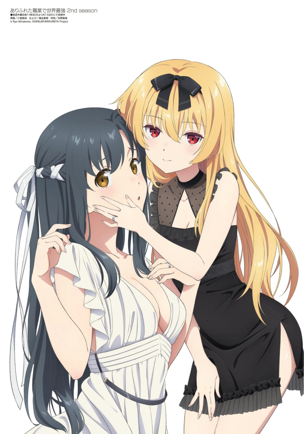 2girls absurdres arifureta_shokugyou_de_sekai_saikyou black_bow black_dress black_hair black_ribbon black_skirt blonde_hair blush bow braid breasts brown_eyes cleavage closed_mouth collarbone dot_nose dress female_focus hair_bow hair_ribbon highres japanese_text large_breasts legs long_hair looking_at_viewer miniskirt multiple_girls open_mouth red_eyes ribbon scan shirasaki_kaori skirt sleeveless sleeveless_dress small_breasts smile thighs translation_request vampire white_dress yue_(arifureta)