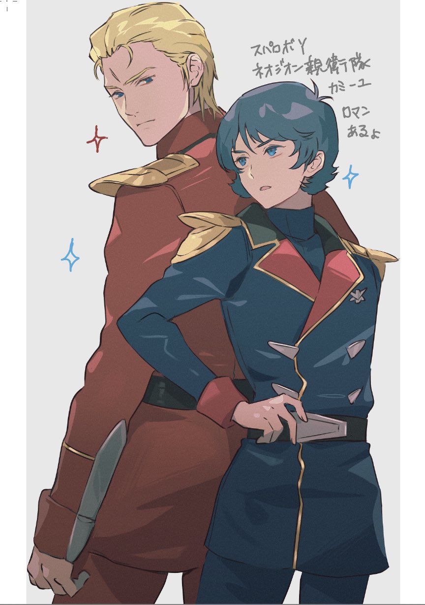 2boys blonde_hair blue_eyes blue_hair casval_rem_deikun char's_counterattack char_aznable epaulettes gundam hand_on_own_hip highres kamille_bidan kasumi_(skchkko) long_sleeves military_uniform mullet multiple_boys neo_zeon open_mouth short_hair simple_background translation_request zeon zeta_gundam