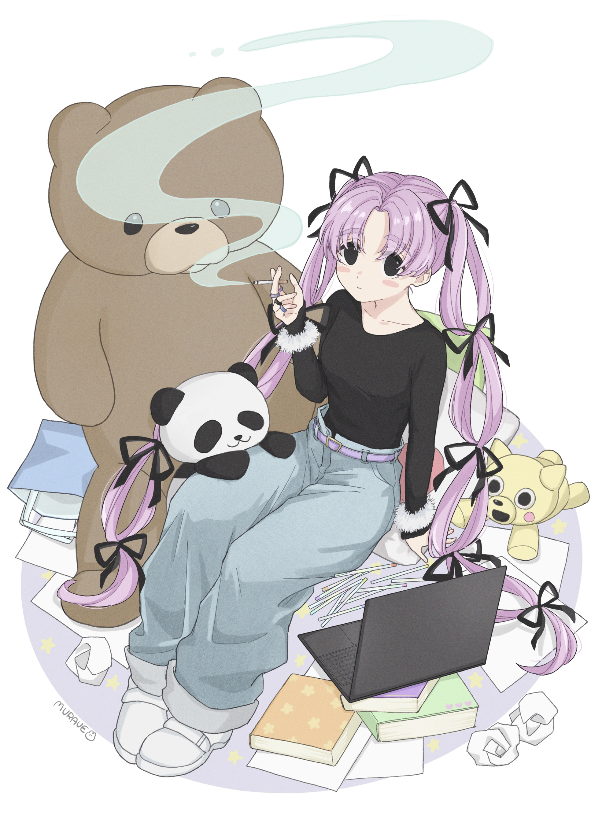 1girl absurdres artist_name atari_(sakamoto_days) bag baggy_pants belt black_eyes black_shirt blue_pants blush_stickers book book_stack breasts cigarette closed_mouth commentary_request computer crumpled_paper curtained_hair from_above full_body fur_wrist_cuffs heart highres holding holding_cigarette jewelry laptop long_hair long_sleeves looking_at_viewer multiple_hair_ribbons multiple_rings pants pillow pink_belt pink_hair ring sakamoto_days shirt shoes shopping_bag simple_background sitting smoke smoke_trail smoking solo star_(symbol) stuffed_animal stuffed_panda stuffed_toy teddy_bear twintails user_aggf4548 very_long_hair white_background white_shoes wrist_cuffs