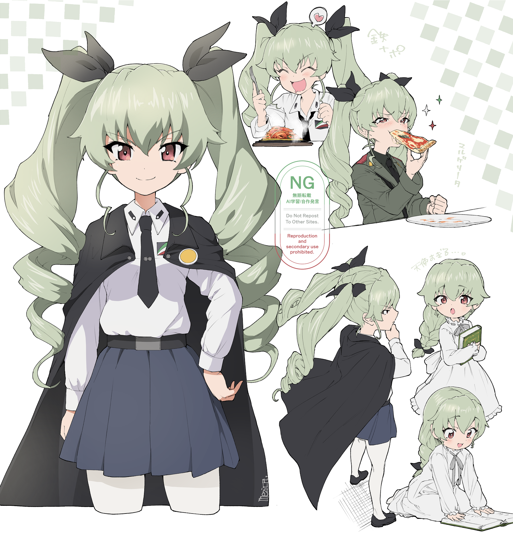 1girl :d aged_down anchovy_(girls_und_panzer) anzio_military_uniform anzio_school_uniform artist_name belt black_belt black_cape black_necktie black_ribbon black_shirt black_shoes blue_skirt book braid braided_ponytail cape closed_eyes closed_mouth commentary dress dress_shirt drill_hair eating emblem food fork frilled_dress frills girls_und_panzer green_hair grey_jacket hair_ribbon half-closed_eyes hand_on_own_hip heart highres hira_mejika holding holding_book holding_food holding_fork jacket loafers long_dress long_hair long_sleeves looking_at_viewer loose_necktie military_uniform miniskirt multiple_views necktie open_mouth pantyhose plate pleated_skirt reading red_eyes ribbon saliva sam_browne_belt school_uniform shirt shoes signature single_braid skirt smile spoken_heart standing translated twin_drills twintails white_dress white_pantyhose white_shirt wing_collar