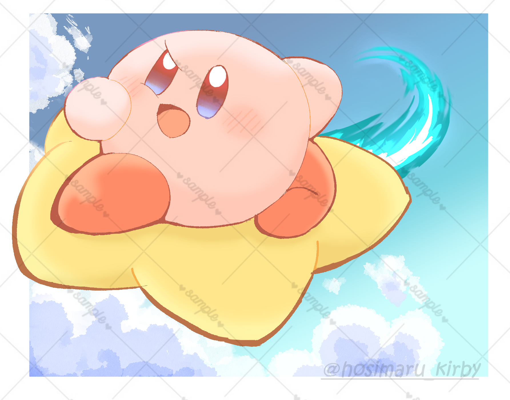 blue_eyes blue_sky blush border bright_pupils commentary_request highres hosimaru_kirby kirby kirby_(series) nintendo no_humans open_mouth riding sky solo twitter_username white_border white_pupils