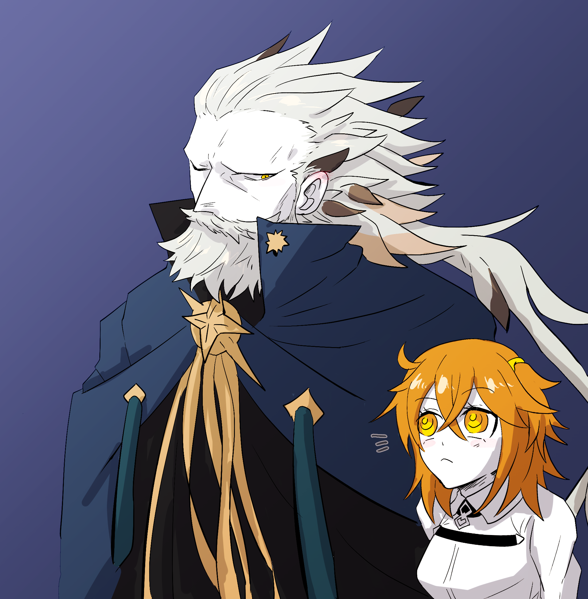 1boy 1girl 816_lau ahoge beard blue_background blue_cape cape commentary_request facial_hair fate/grand_order fate_(series) fujimaru_ritsuka_(female) full_beard hair_between_eyes highres long_hair long_sleeves looking_at_another mustache one_eye_closed orange_eyes orange_hair ptolemy_(fate) ptolemy_(third_ascension)_(fate) short_hair simple_background upper_body
