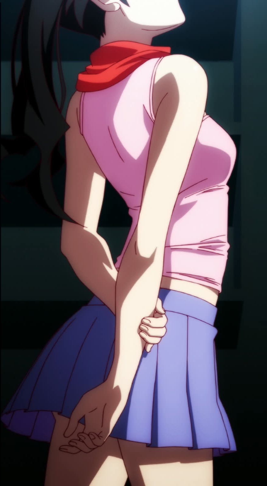 1girl anime_screenshot araragi_karen arms_behind_back black_hair breasts camisole female_focus highres indoors legs long_bangs long_hair midriff miniskirt monogatari_(series) nisemonogatari pink_camisole pleated_skirt ponytail purple_skirt red_scarf scarf skirt sleeveless small_breasts solo solo_focus stitched stomach thighs third-party_edit