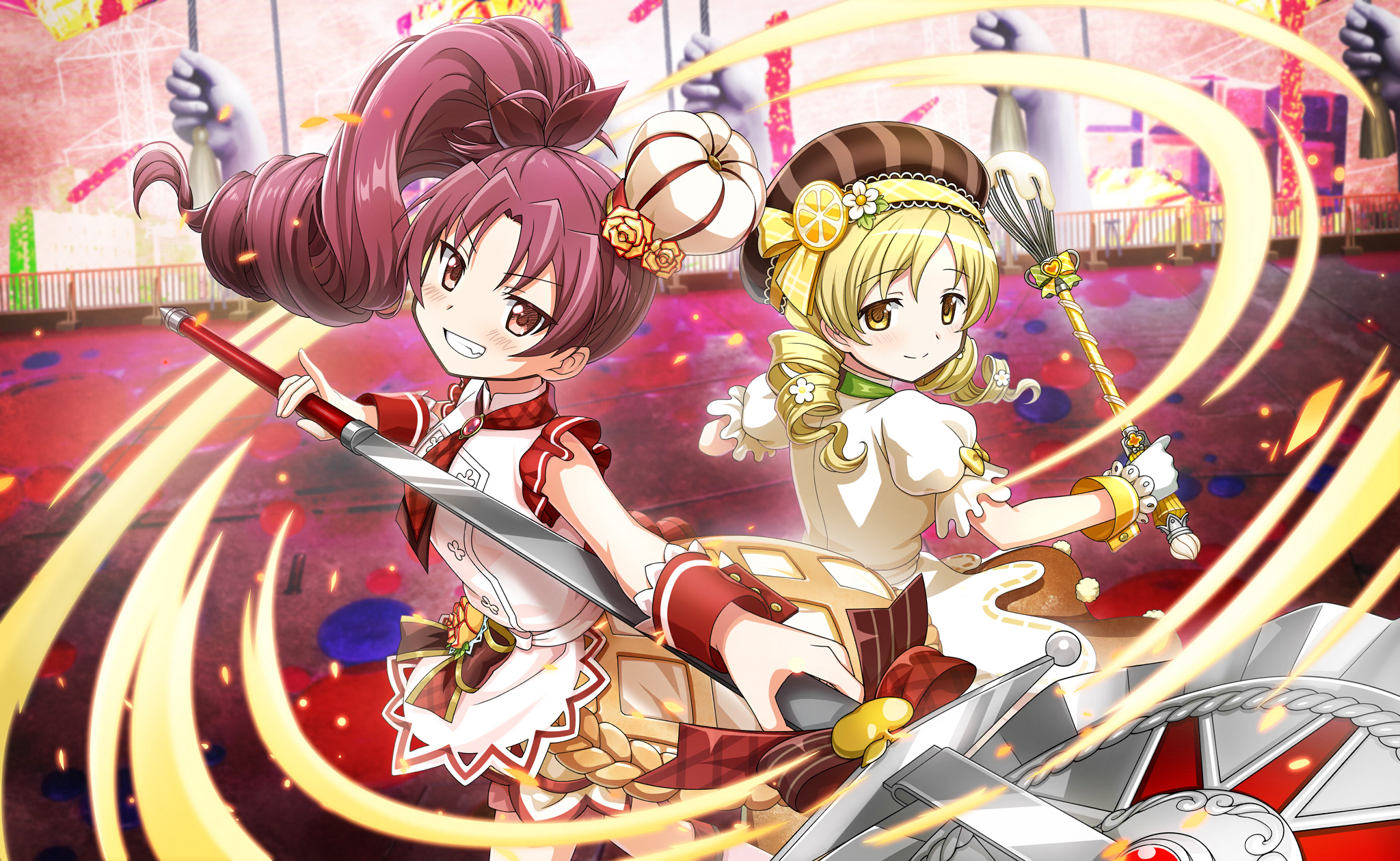 2girls abstract_background anime_coloring apron argyle_bow argyle_clothes argyle_skirt artist_request ascot back-to-back beret blonde_hair bow brooch brown_bow brown_hat brown_skirt bubble_skirt buttons chef_hat closed_mouth cowboy_shot dot_nose double-breasted drill drill_hair embers fang floating_clothes floating_hair flower flower_button food food-themed_clothes frilled_shirt frilled_sleeves frills fruit game_cg gem gloves gold_buttons green_ascot grin hair_bow hair_flower hair_ornament happy hat hat_bow hat_flower hat_ornament high_side_ponytail highres holding holding_polearm holding_weapon holding_whip icing jewelry lace lace-trimmed_apron lace-trimmed_headwear lace-trimmed_skirt lace-trimmed_wrist_cuffs lace_trim leaf lemon lemon_hat_ornament lemon_slice light_blush light_particles long_hair looking_back magical_girl mahou_shoujo_madoka_magica mahou_shoujo_madoka_magica_(anime) mahou_shoujo_madoka_magica_magia_exedra mini_chef_hat mini_hat miniskirt motion_lines multiple_girls official_alternate_costume official_art orange_flower orange_rose outline pizza_cutter plaid_ascot plaid_bow plaid_clothes polearm puffy_short_sleeves puffy_sleeves red_ascot red_bow red_eyes red_gem red_hair red_wrist_cuffs ribbon-trimmed_apron ribbon_trim rose sakura_kyoko sakura_kyoko_(crimson_confectioner) shirt short_sleeves skirt sleeve_bow sleeveless sleeveless_shirt smile striped_clothes striped_headwear tareme third-party_source tomoe_mami tomoe_mami_(panna_vorticosa) tsurime twin_drills v-shaped_eyebrows vertical-striped_clothes vertical-striped_headwear waist_apron waist_bow weapon whip white_apron white_flower white_gloves white_outline white_shirt witch's_labyrinth wrist_cuffs yellow_bow yellow_eyes yellow_wrist_cuffs
