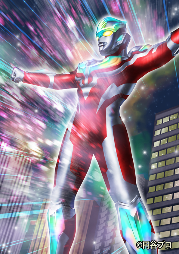 1boy alien aqua_armor armor breastplate building clenched_hand color_timer colored_skin commentary_request copyright_notice from_below giant glowing glowing_armor glowing_eyes multicolored_skin muscular muscular_male night official_art outdoors outstretched_arms red_skin silver_skin solo spread_arms tokusatsu ultra_series ultraman_ginga ultraman_ginga_(series) yasukuni_kazumasa yellow_eyes