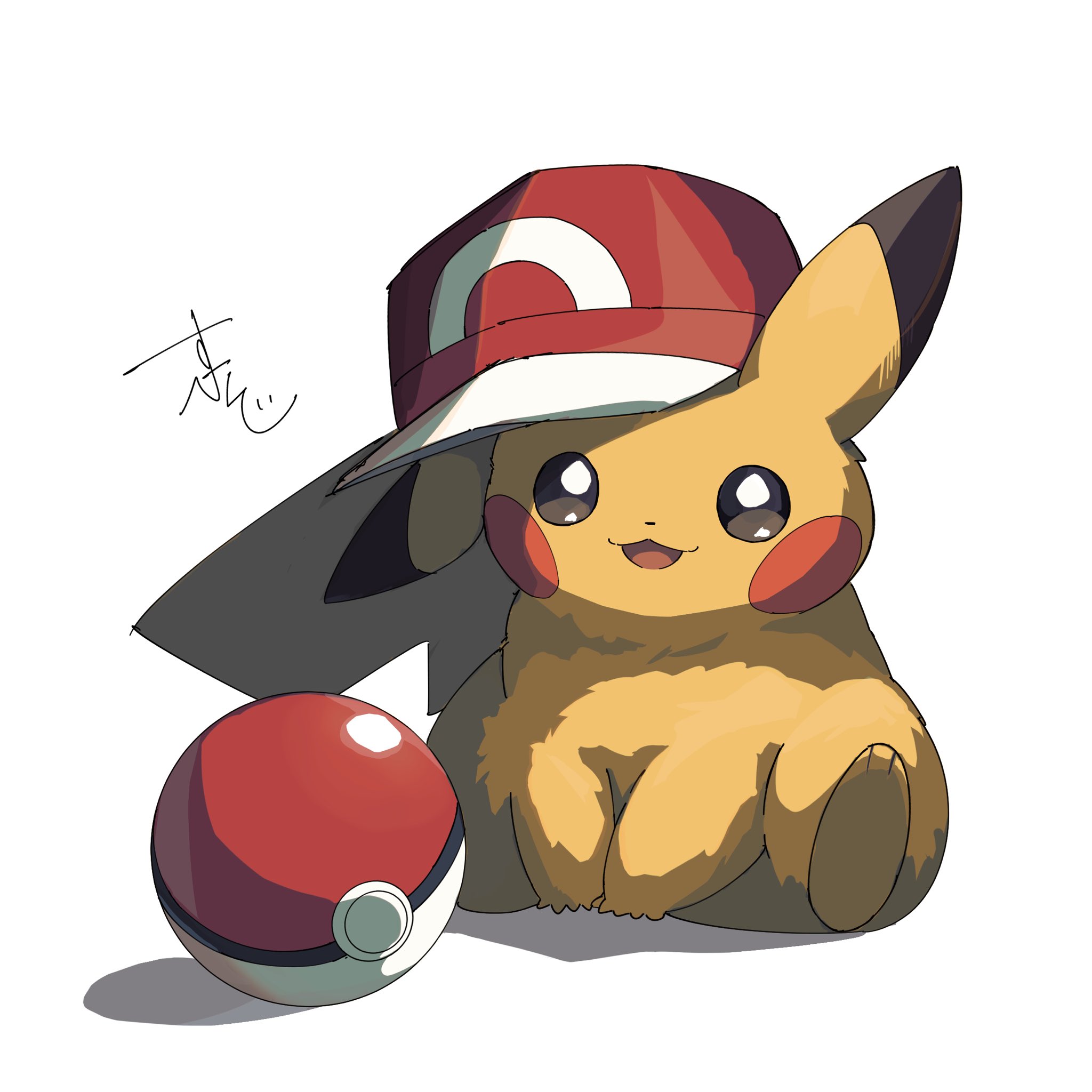 commentary_request gen_1_pokemon hat highres looking_at_viewer nintendo no_humans open_mouth pikachu poke_ball poke_ball_(basic) pokemon pokemon_(anime) pokemon_(creature) pokemon_focus pokemon_the_series:_xy sitting smile solo supiraji_penpen