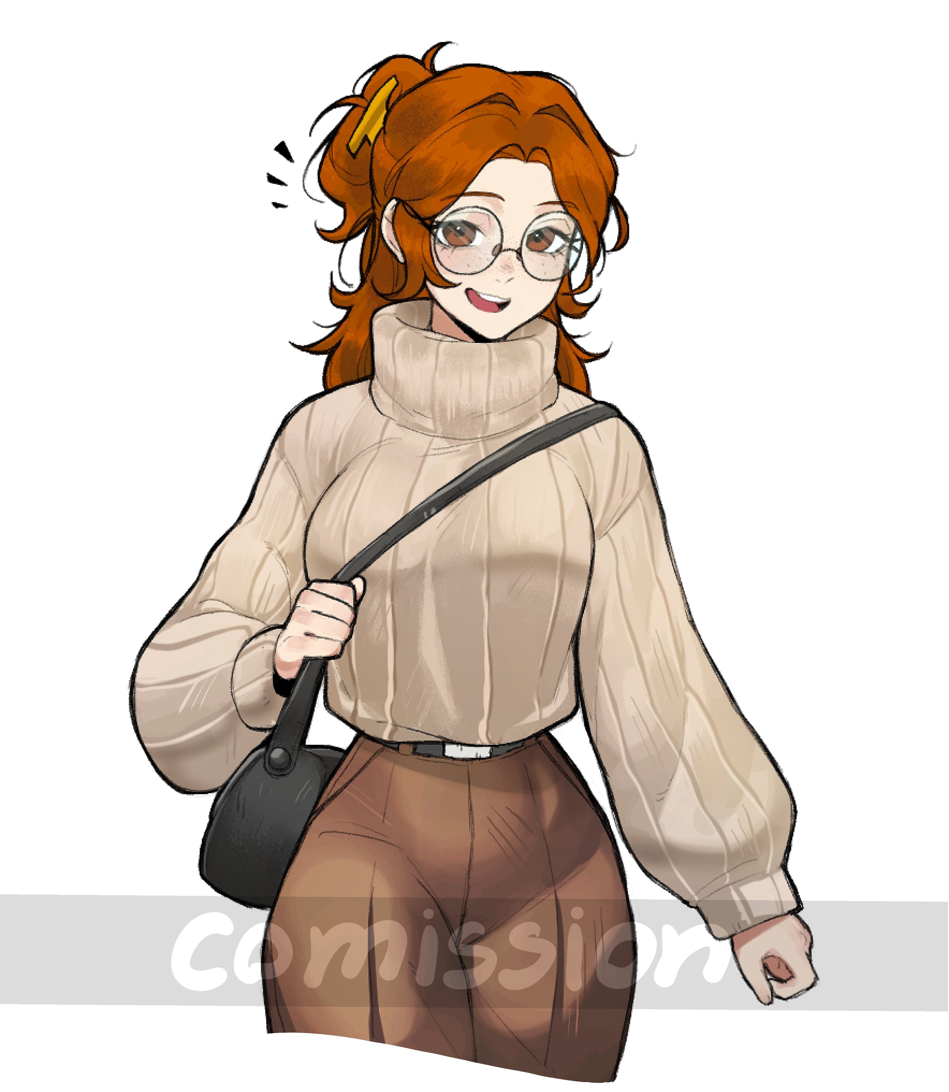 1girl absurdres bag black_bag breasts brown_eyes brown_hair brown_pants brown_sweater character_request commentary commission copyright_request cropped_legs eyelashes gale_bar glasses hair_intakes handbag highres holding_strap long_hair long_sleeves notice_lines one_side_up open_mouth pants round_eyewear simple_background smile solo sweater teeth turtleneck turtleneck_sweater upper_teeth_only white_background