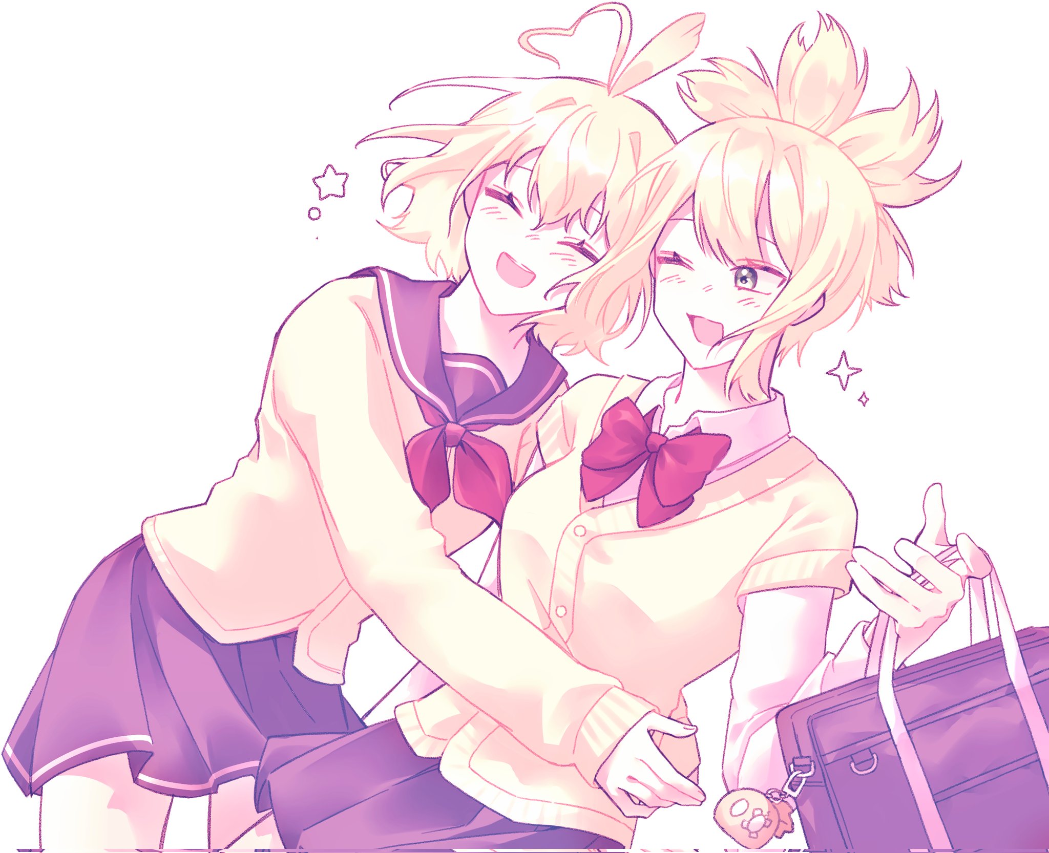 2girls ^_^ ahoge alternate_costume bag black_skirt blonde_hair blush bow bowtie cardigan charm_(object) closed_eyes commentary_request dr._stone expressive_hair heart heart_ahoge highres holding holding_bag hug kohaku_(dr._stone) korean_commentary long_sleeves multiple_girls one_eye_closed open_mouth pointy_hair ponytail red_bow red_bowtie sailor_collar school_bag school_uniform serafuku shirt short_hair simple_background skirt smile sparkle star_(symbol) suika_(dr.stone) sweater white_background yellow_cardigan yellow_sweater yuhachan3
