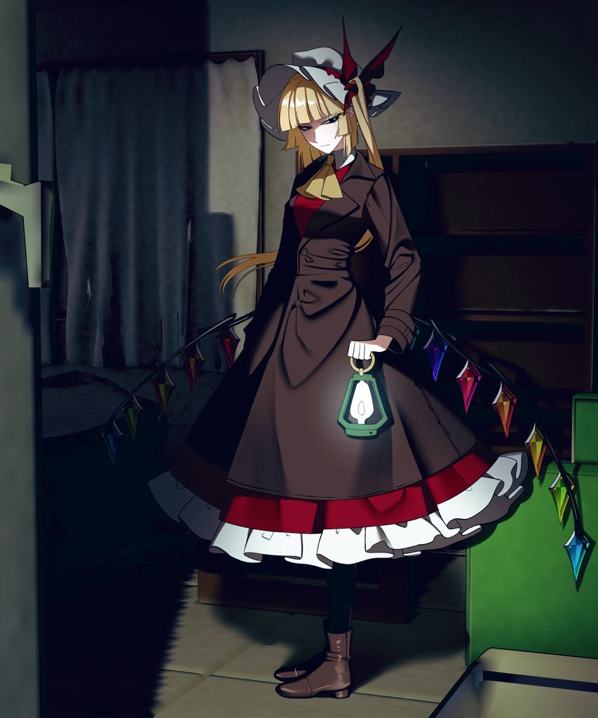 1girl alternate_costume ascot blonde_hair boots brown_boots brown_coat closed_mouth coat commentary_request crystal crystal_wings flandre_scarlet frilled_skirt frills full_body hat holding holding_lantern lantern long_hair long_sleeves looking_at_viewer medium_hair mob_cap multicolored_wings nubezon one_side_up red_skirt red_vest skirt skirt_set solo touhou vest white_hat wings yellow_ascot