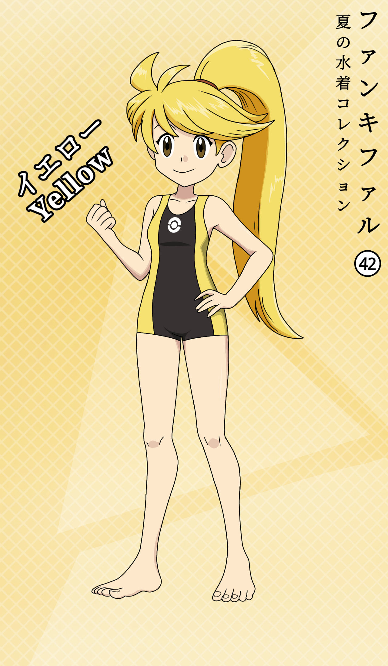 1girl absurdres ahoge armpit_crease artist_name barefoot blonde_hair breasts brown_eyes casual_one-piece_swimsuit character_name clenched_hand collarbone eyebrows_hidden_by_hair fankifalu feet female_focus full_body hand_on_own_hip hand_up happy high_ponytail highleg highleg_one-piece_swimsuit highres japanese_text knees legs long_hair looking_at_viewer neck nintendo official_style one-piece_swimsuit petite poke_ball_symbol pokemon pokemon_adventures ponytail skin_tight small_breasts smile standing swimsuit thighs toenails toes two-tone_one-piece_swimsuit very_long_hair yellow_(pokemon) yellow_background