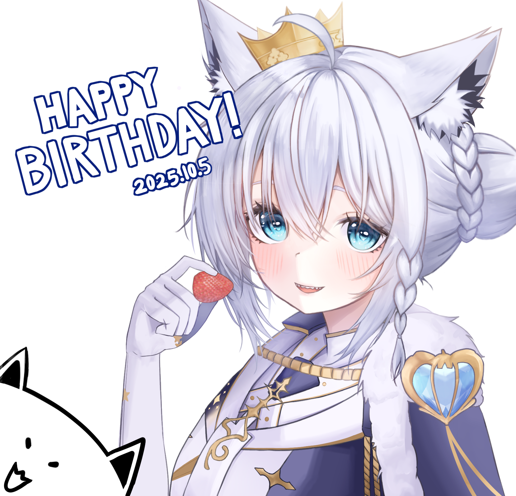 1girl ahoge animal_ears aqua_eyes braid commentary drawingmochi7 elbow_gloves english_text food fox_ears fox_girl fruit fubuzilla_(shirakami_fubuki) gloves hair_between_eyes happy_birthday highres holding holding_food hololive looking_at_viewer official_alternate_costume shirakami_fubuki shirakami_fubuki_(fbkingdom) simple_background strawberry untranslatable_commentary virtual_youtuber white_gloves white_hair
