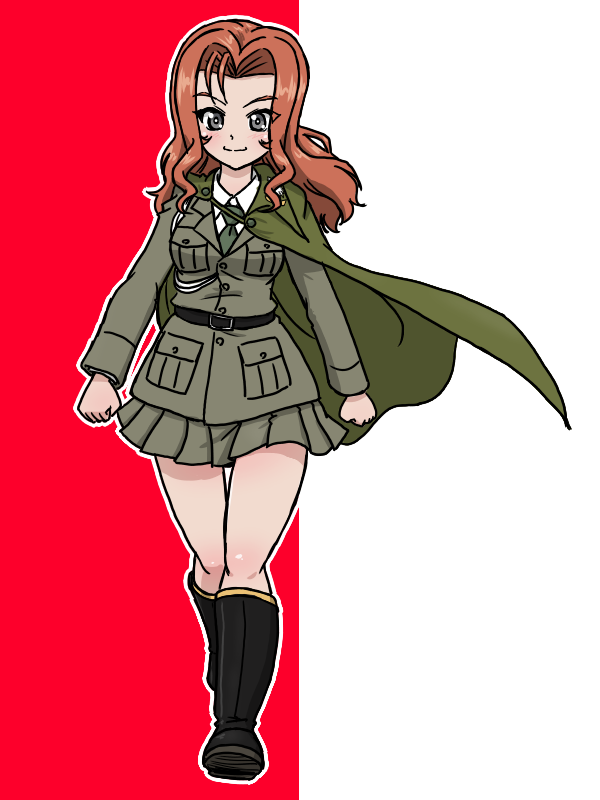 1girl blue_eyes blush bonple_military_uniform breasts brown_hair cape closed_mouth commentary_request full_body girls_und_panzer long_hair looking_at_viewer maiko_(girls_und_panzer) military_uniform small_breasts smile solo takahashi_kurage