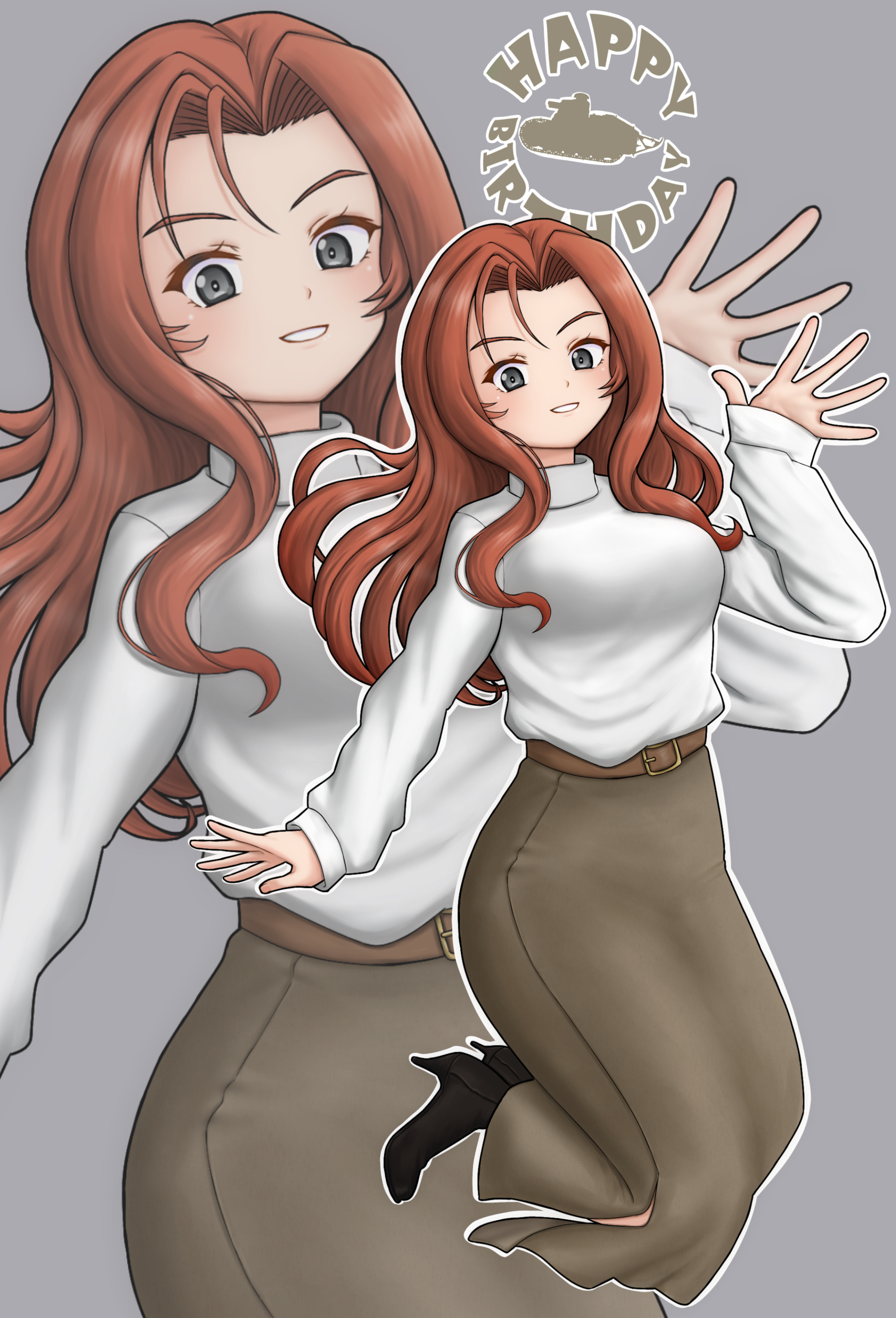 1girl absurdres amanone_yun blush brown_hair commentary_request girls_und_panzer grey_background grey_eyes high_heels highres long_hair looking_at_viewer maiko_(girls_und_panzer) simple_background skirt smile solo sweater white_sweater