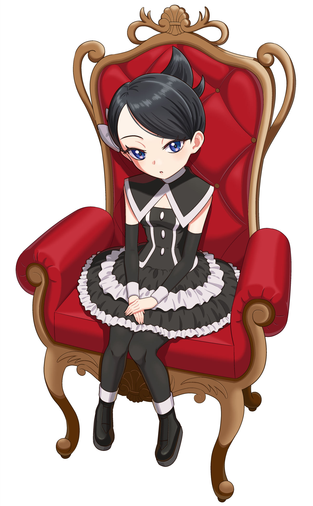 1girl :o black_dress black_hair black_pantyhose black_shoes black_sleeves blue_eyes chair commentary detached_sleeves dress eyelashes highres marley_(pokemon) merymalia nintendo open_mouth pantyhose pokemon pokemon_diamond/pearl/platinum shoes short_hair simple_background sitting solo white_background