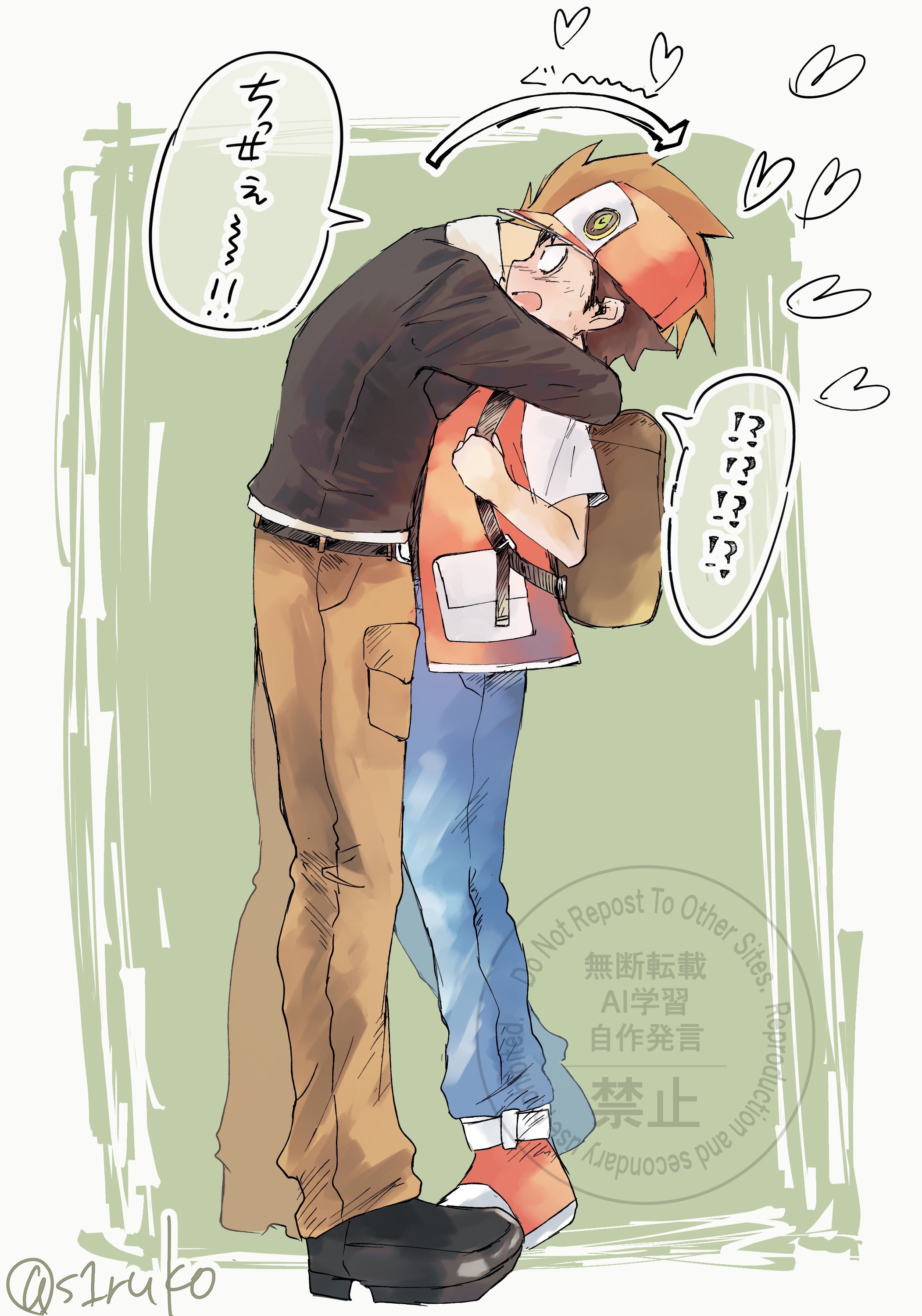 2boys absurdres arrow_(symbol) backpack bag blue_oak blue_pants brown_bag brown_hair commentary_request from_side hat heart highres holding_strap hug jacket male_focus multiple_boys nintendo pants pokemon pokemon_hgss pokemon_rgby red_(pokemon) red_hat red_shoes shiruko_(s1ruko) shoes short_hair short_sleeves speech_bubble translation_request twitter_username watermark yaoi