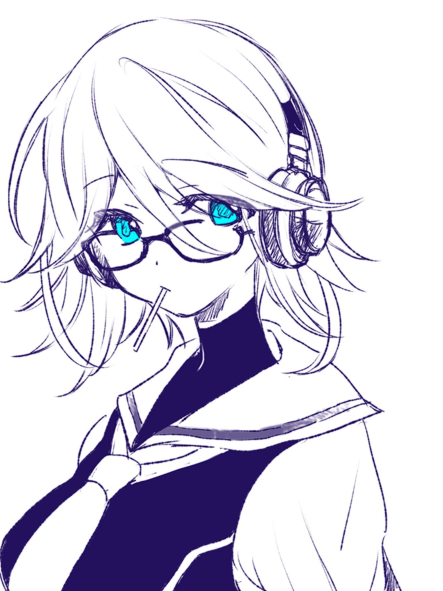 1girl blue_eyes breasts chaos;child commentary_request dress expressionless food_in_mouth glasses glowing glowing_eyes headphones high_collar highres holding holding_headphones kazuki_hana koto_052000 lollipop_in_mouth looking_at_viewer medium_breasts medium_hair necktie sailor_collar science_adventure shirt short_hair short_necktie sleeveless sleeveless_dress solo white_sailor_collar white_shirt