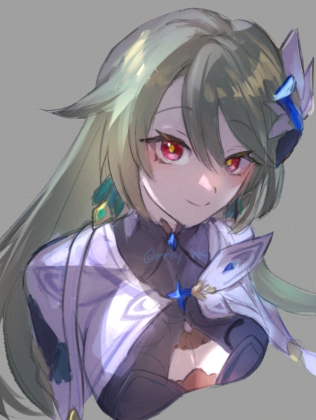 1girl closed_mouth commentary cropped_torso earrings green_hair grey_background honkai_(series) honkai_impact_3rd jewelry looking_at_viewer mmhy_hk red_eyes signature simple_background smile solo vita_(honkai_impact) vita_(lone_planetfarer)_(honkai_impact) yellow_pupils