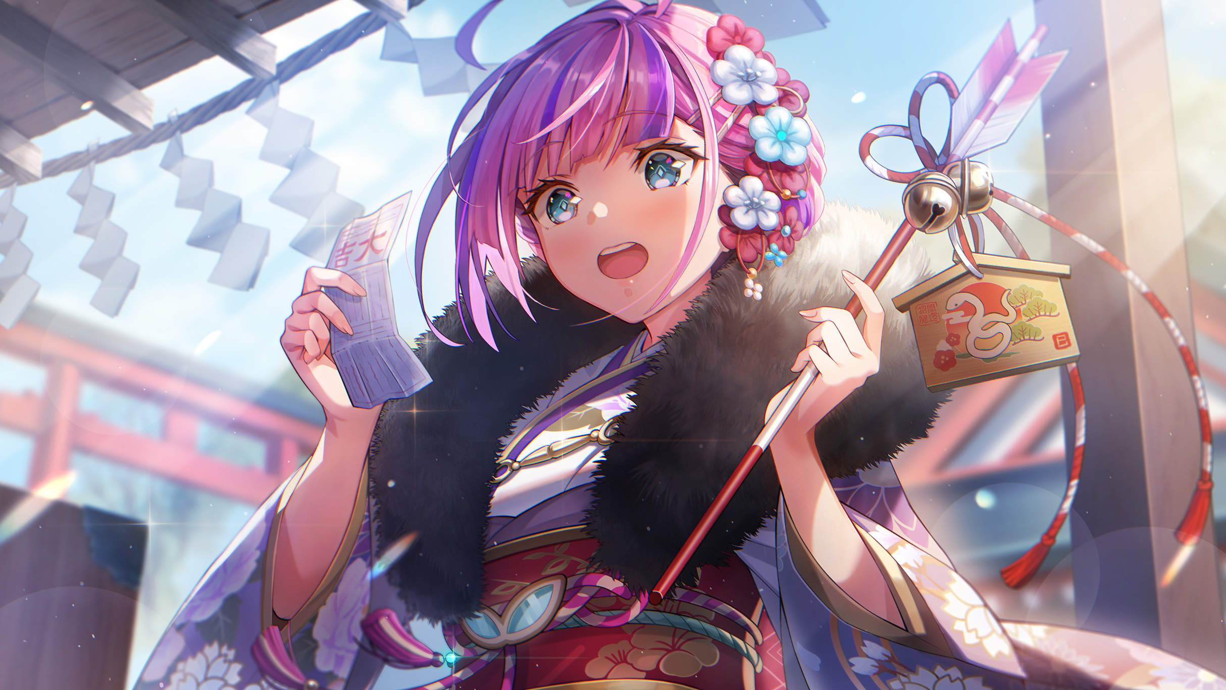 1girl :o ahoge arrow_(projectile) bell black_fur blue_eyes blue_sky blunt_bangs blurry blurry_background blush chinese_zodiac date_akari date_akari_(good_luck_on_the_clear_winter) day downturned_eyes ema fingernails floral_print floral_print_kimono floral_print_sash flower fur-trimmed_kimono fur_trim furisode hair_bun hair_flower hair_ornament hamaya hands_up hatsumoude heaven_burns_red highres holding holding_arrow holding_omikuji huge_ahoge japanese_clothes jingle_bell kanzashi kimono long_sleeves looking_at_object multicolored_hair new_year official_alternate_costume official_alternate_hairstyle official_art omikuji open_mouth outdoors print_kimono print_sash purple_hair purple_streaks red_flower red_sash sash shrine sidelighting sidelocks single_hair_bun sky snake_print solo sparkle streaked_hair sunlight surprised teeth torii translated upper_body upper_teeth_only white_flower white_kimono wide_sleeves year_of_the_snake