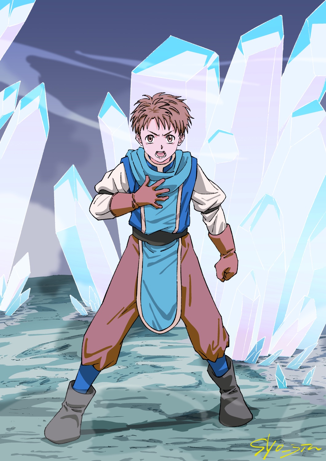 1boy brown_eyes brown_hair commentary_request full_body gensou_suikoden gensou_suikoden_i gloves highres long_sleeves looking_at_viewer male_focus open_mouth scarf short_hair solo syo_jin ted_(suikoden)
