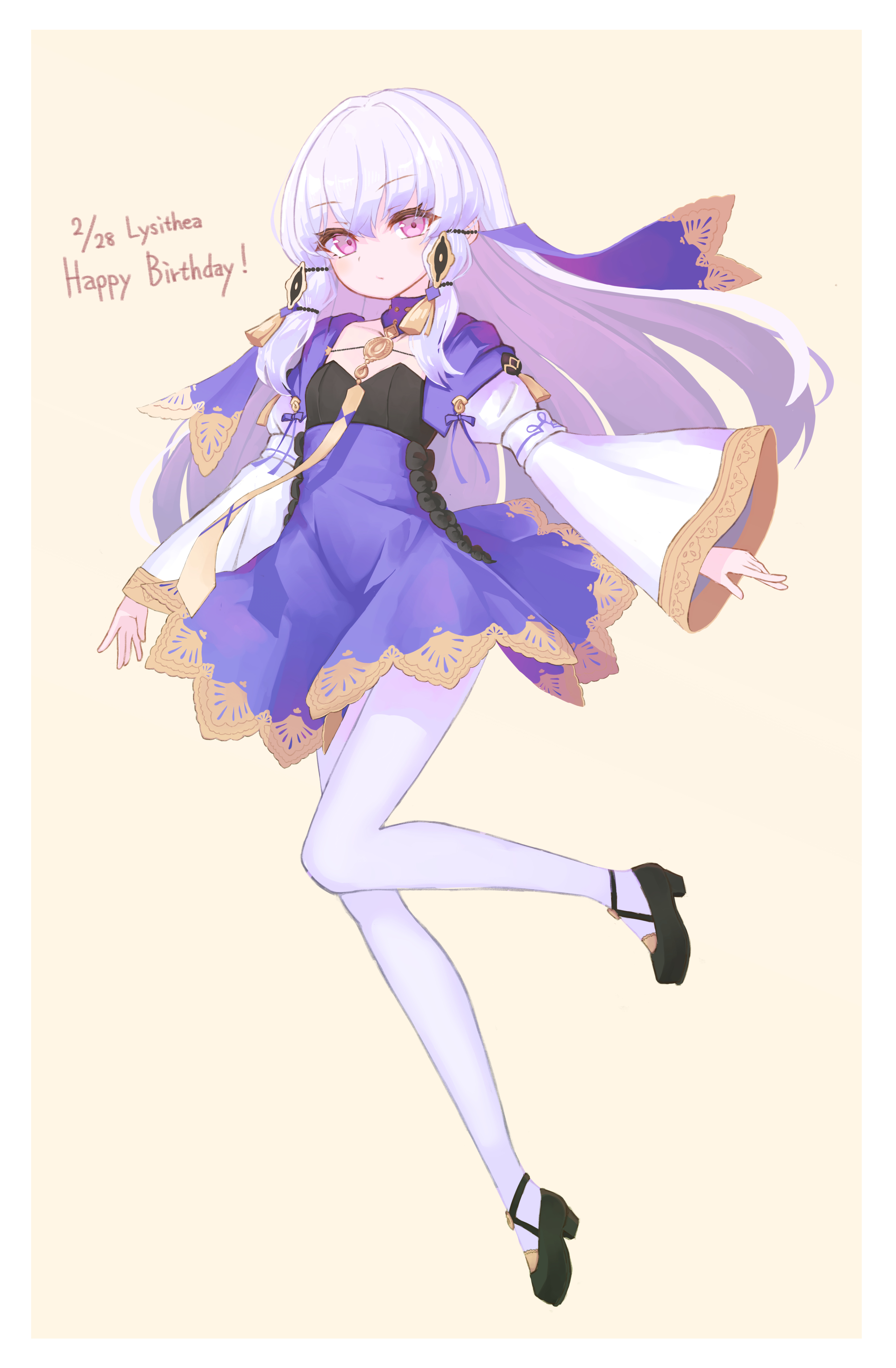 1girl absurdres black_shoes border character_name commentary_request dated fire_emblem fire_emblem:_three_houses flat_chest full_body happy_birthday highres long_hair lysithea_von_ordelia lysithea_von_ordelia_(timeskip) mixed-language_commentary nintendo pantyhose pink_eyes sepia_(kilikasumi) shoes simple_background solo veil white_border white_hair white_pantyhose yellow_background