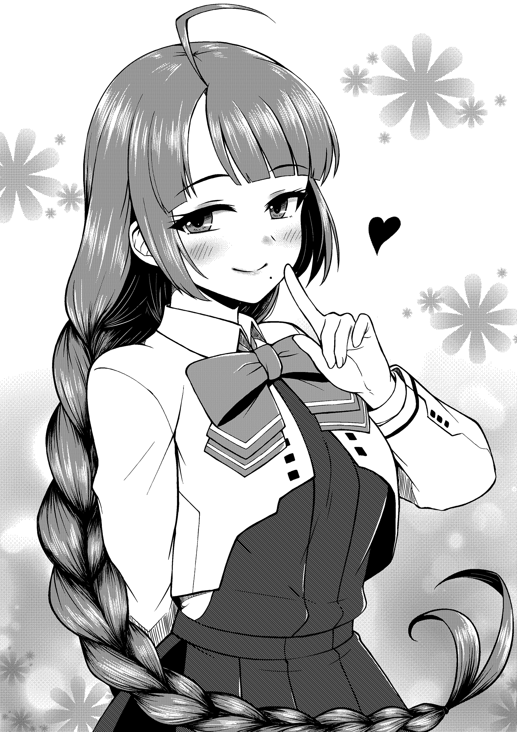 1girl ahoge blazer blunt_bangs bow bowtie commentary_request dress floral_background greyscale halter_dress halterneck highres index_finger_raised jacket kamiya_tadato kantai_collection long_hair looking_at_viewer monochrome smile solo upper_body yuugumo_(kancolle) yuugumo_kai_ni_(kancolle)