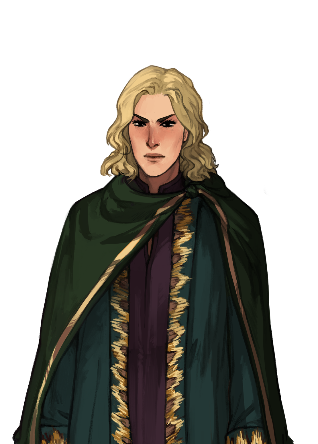 >:( 1boy arrapso blonde_hair cloak collared_shirt cowboy_shot facing_viewer furrowed_brow gold_trim green_robe highres lake_of_voices large_variant_set looking_at_viewer male_focus non-web_source official_art red_shirt robe self-datamine shirt short_hair solo tachi-e the_guide_(lake_of_voices) v-shaped_eyebrows variant_set wavy_hair