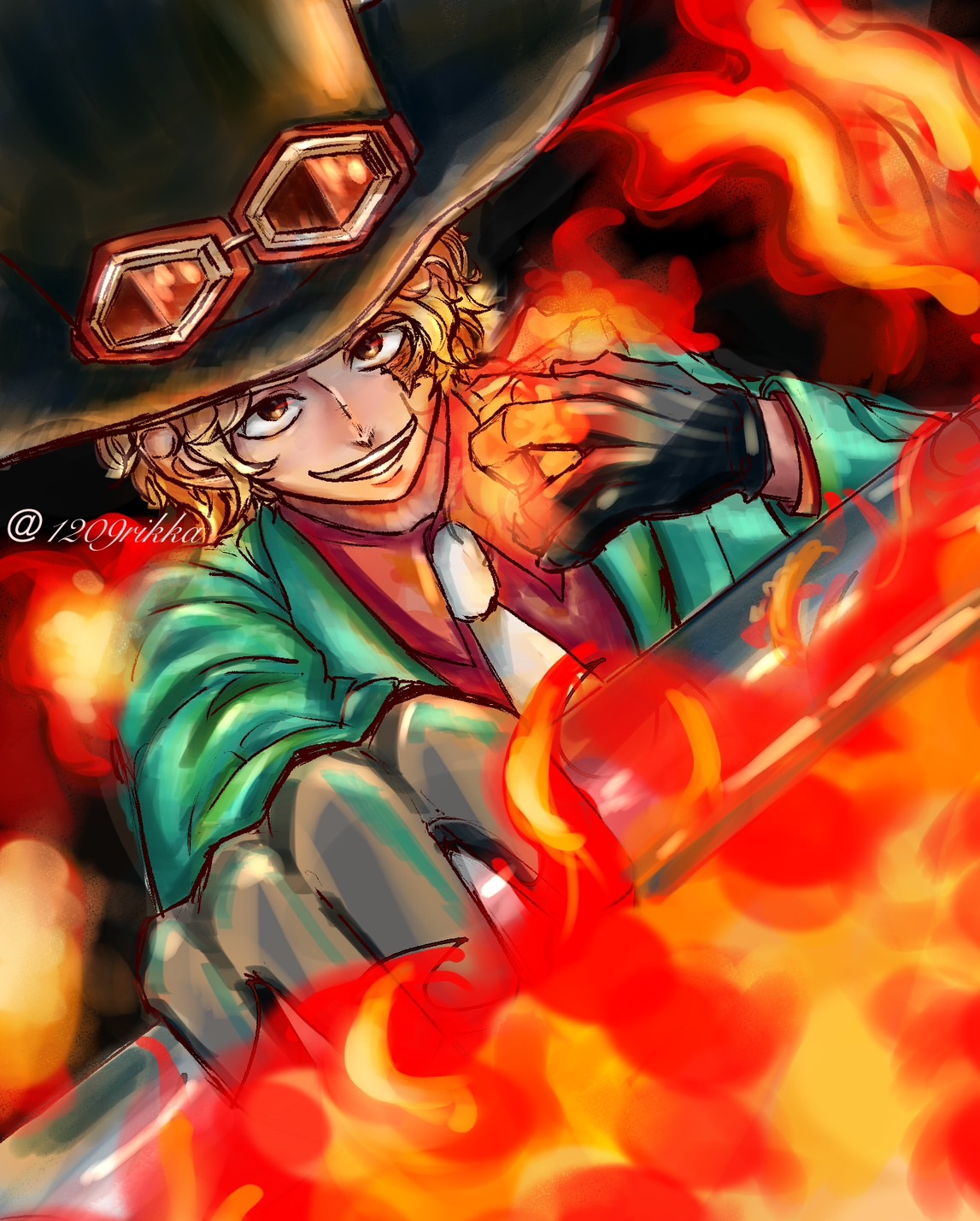 1209rikka 1boy aqua_coat black_gloves blonde_hair coat collared_shirt commentary_request dutch_angle gloves goggles goggles_on_headwear highres holding looking_at_viewer male_focus necktie one_piece one_piece:_stampede red_shirt sabo_(one_piece) scar scar_on_face shirt short_hair smile solo twitter_username upper_body white_necktie