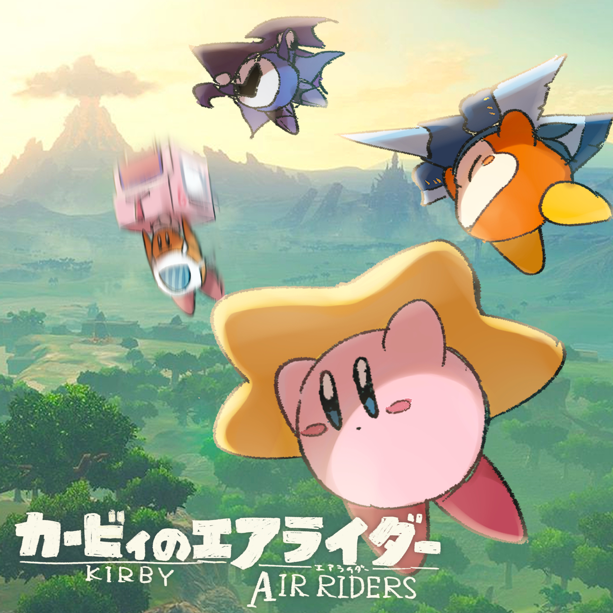 bandana_waddle_dee blush_stickers brand_name_imitation chef_kawasaki closed_eyes colored_skin commentary_request falling highres imo_yaco kirby kirby_(series) kirby_air_ride kirby_air_riders meta_knight motion_blur nintendo outdoors pink_skin screenshot_background shadow_star the_legend_of_zelda the_legend_of_zelda:_breath_of_the_wild volcano wagon_star warp_star wing_star