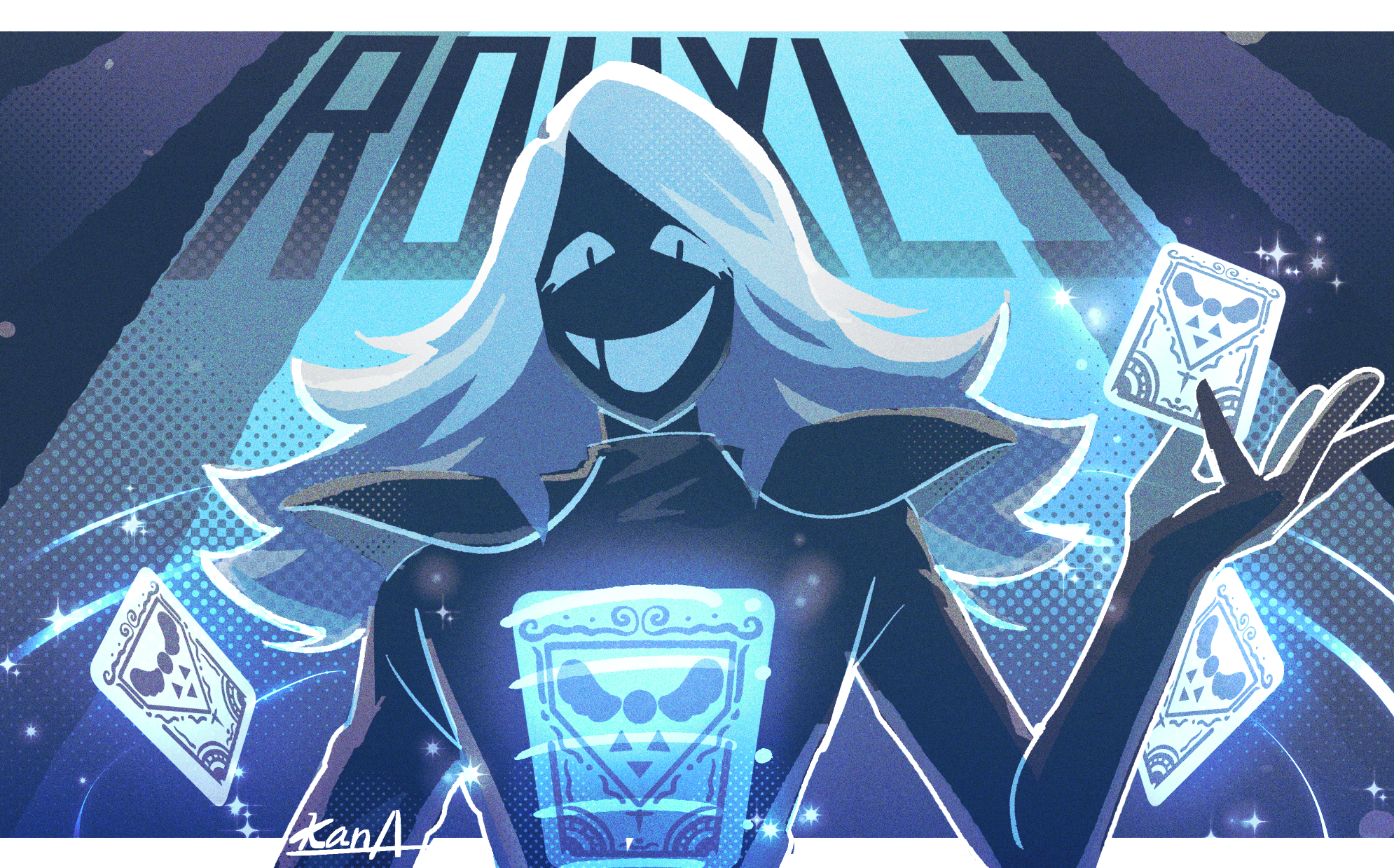 1boy black_jacket blue_background blue_skin card character_name colored_skin commentary_request delta_rune_(symbol) deltarune grin highres holding holding_card jacket kana_(kanaice) letterboxed looking_at_viewer male_focus medium_hair outside_border rouxls_kaard signature smile solo sparkle upper_body utdr_(toby_fox) white_hair