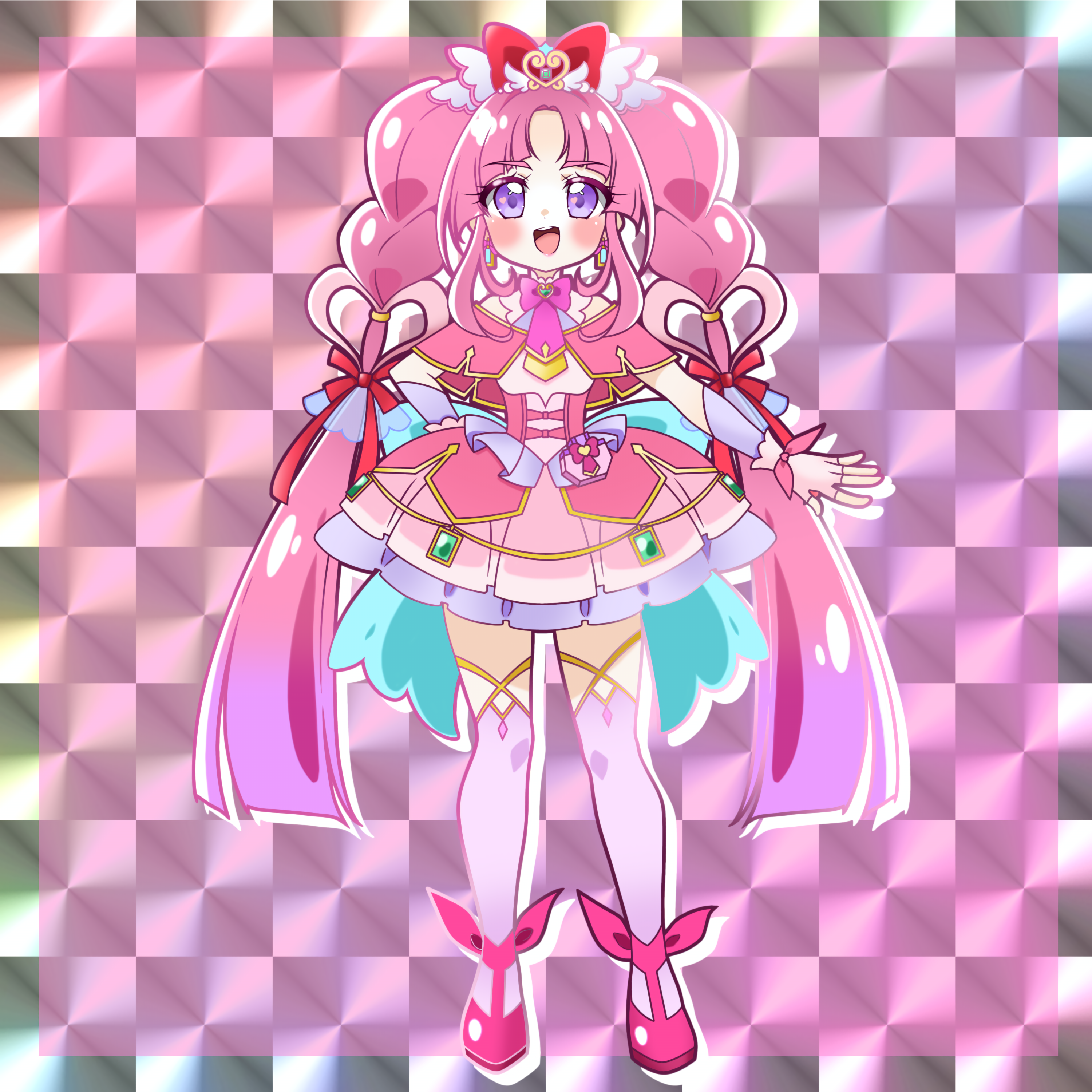 1girl absurdres back_bow blue_bow bow bowtie braid brooch capelet checkered_background commentary cure_mystique dress earrings fingerless_gloves frilled_dress frills full_body glove_ribbon gloves grey_gloves grey_thighhighs hair_bow hair_ornament hair_ribbon hand_on_own_hip heart heart_brooch heart_hair_ornament highres jewelry kobayashi_mikuru large_bow layered_gloves long_hair looking_at_viewer magical_girl meitantei_precure! open_mouth pact_holder parted_bangs pink_bow pink_bowtie pink_dress pink_hair precure purple_eyes red_bow red_capelet red_dress red_ribbon red_shoes ribbon shoes short_dress sleeveless sleeveless_dress smile solo standing thighhighs twin_braids two-tone_dress very_long_hair yuunaduse