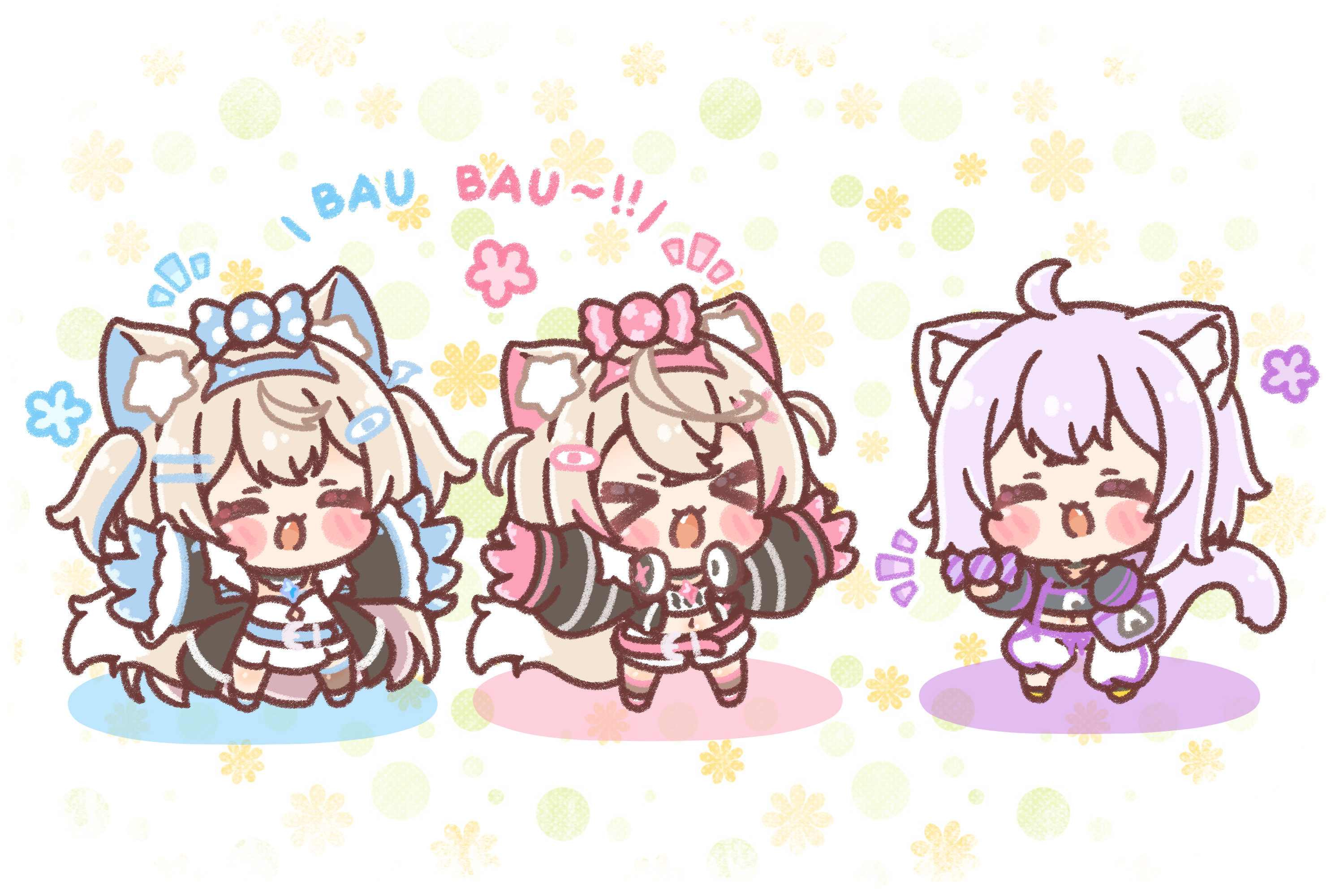 >_< 3girls :3 animal_ear_fluff animal_ears black_coat black_jacket blonde_hair blue_hair blue_hairband blush blush_stickers breasts candy cat_ears cat_girl cat_tail chibi claw_(weapon) closed_eyes coat collar commentary_request cropped_jacket dog_ears dog_girl fang food fur_trim fuwawa_abyssgard fuwawa_abyssgard_(1st_costume) hair_ornament hairband hairclip headphones headphones_around_neck highres hololive hololive_english horns jacket long_hair long_sleeves mitarashi_neko mococo_abyssgard mococo_abyssgard_(1st_costume) multicolored_hair multiple_girls nekomata_okayu nekomata_okayu_(1st_costume) open_mouth outstretched_arms pink_hair pink_hairband purple_hairband short_hair siblings sisters spiked_hairband spikes spread_arms streaked_hair tail trait_connection twins virtual_youtuber weapon