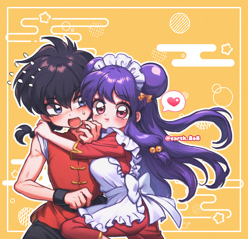 1boy 1girl apron artist_name bell black_hair blush bow braid braided_ponytail chinese_clothes commentary_request earth_8o8 fang flying_sweatdrops hair_bell hair_bow hair_ornament heart korean_commentary long_hair maid_apron maid_headdress open_mouth purple_hair ranma_1/2 red_eyes saotome_ranma shampoo_(ranma_1/2) sidelocks spoken_heart white_apron yellow_bow