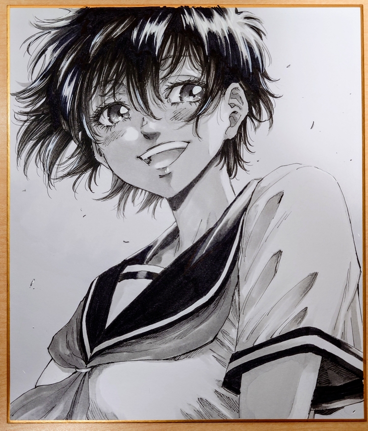 1girl :d choppy_bangs commentary_request greyscale hair_between_eyes happy long_bangs looking_to_the_side makomako1061 monochrome neckerchief open_mouth original photo_(medium) sailor_collar sailor_shirt school_uniform shikishi shirt short_hair short_sleeves sideways_glance smile solo traditional_media turning_head upper_body very_short_hair