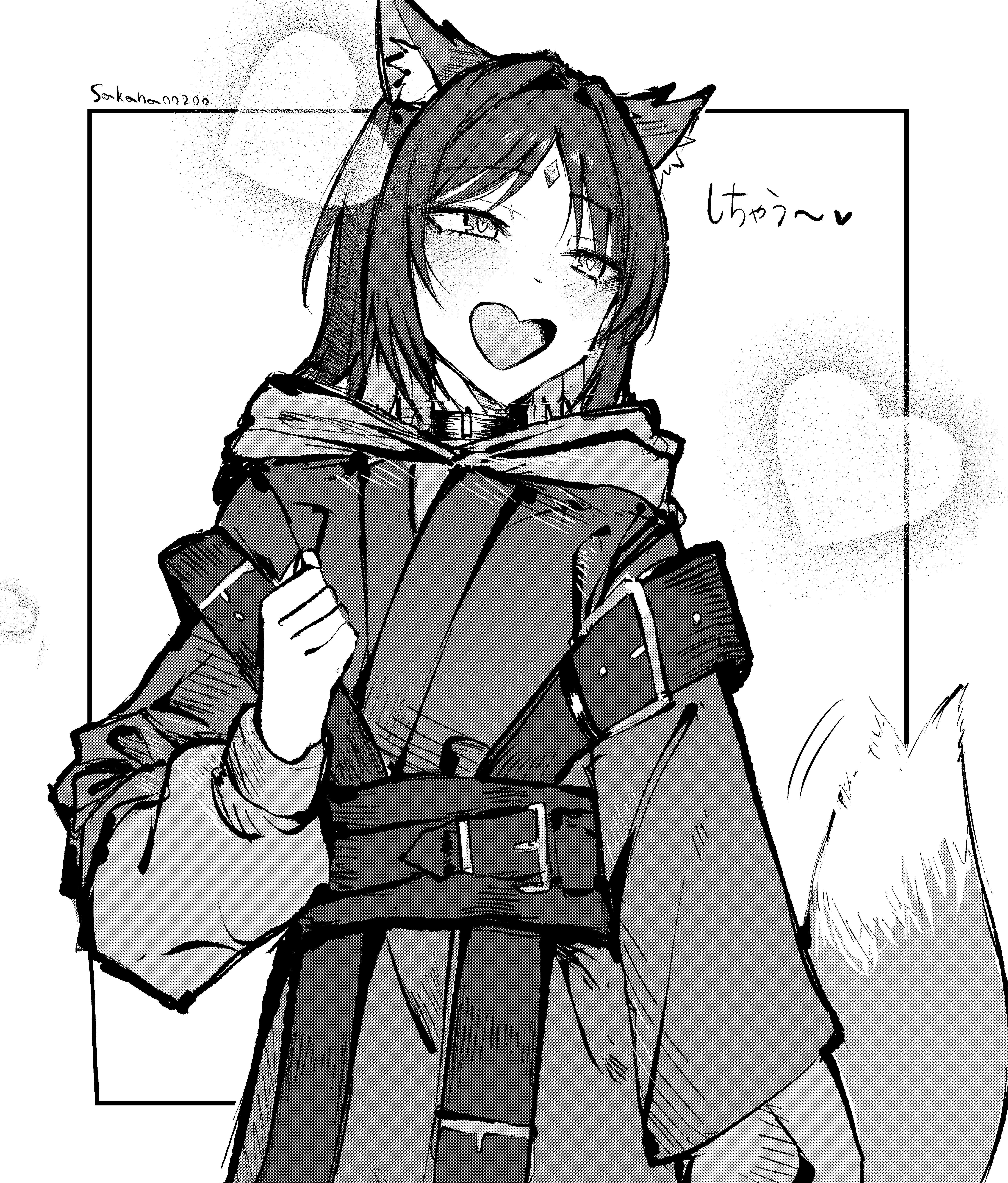 1girl absurdres animal_ears cho_kaguya-hime! commentary fox_ears fox_girl fox_tail greyscale heart heart-shaped_mouth heart-shaped_pupils highres hood hood_down hoodie japanese_clothes kimono medium_hair monochrome open_mouth sakana_(whhy8883) sakayori_iroha solo symbol-shaped_pupils tail