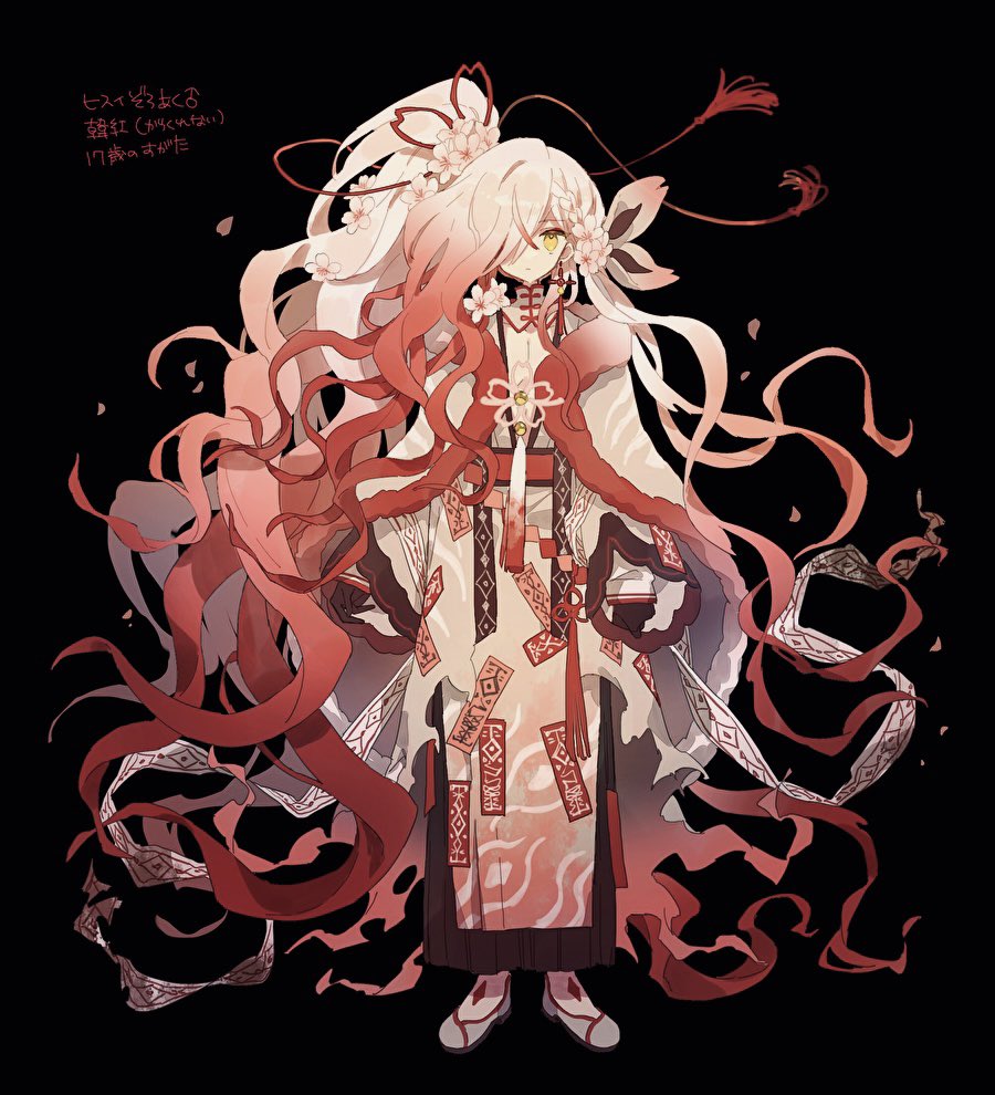 1boy black_background black_gloves coat commentary detached_collar full_body fur-trimmed_coat fur_trim gloves gradient_hair grey_kimono grey_shoes hibi89 hisuian_zoroark humanization japanese_clothes kimono looking_at_viewer multicolored_hair nintendo ofuda pokemon red_hair red_ribbon red_sash ribbon sash shoes simple_background solo standing untranslatable_commentary white_hair yellow_eyes