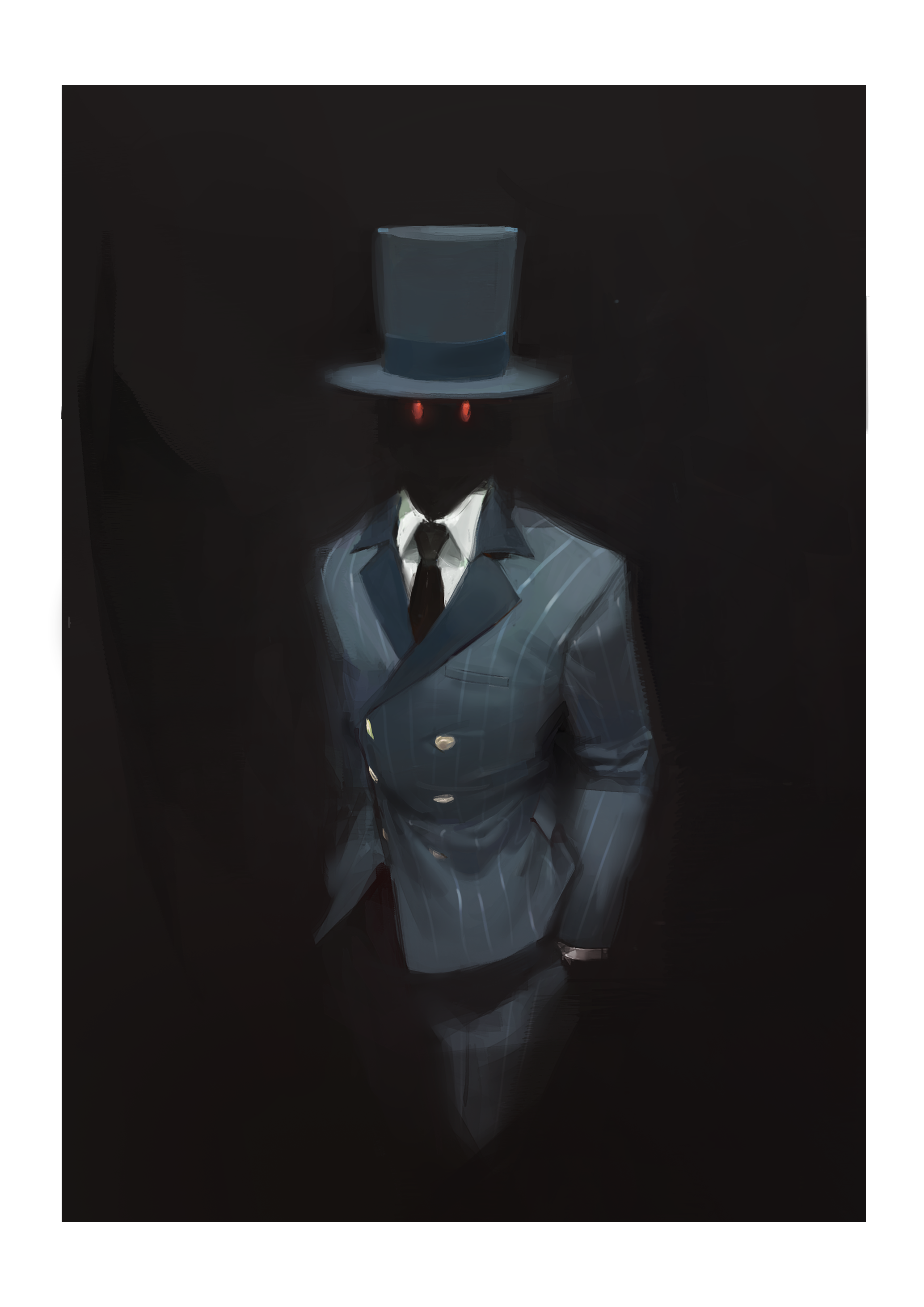 1other absurdres black_background black_hat black_necktie border commentary english_commentary fate/strange_fake fate_(series) formal_clothes hand_in_pocket hat highres jack_the_ripper_(fate/strange_fake) kingofmars long_sleeves looking_at_viewer necktie pocket red_eyes simple_background suit top_hat white_border