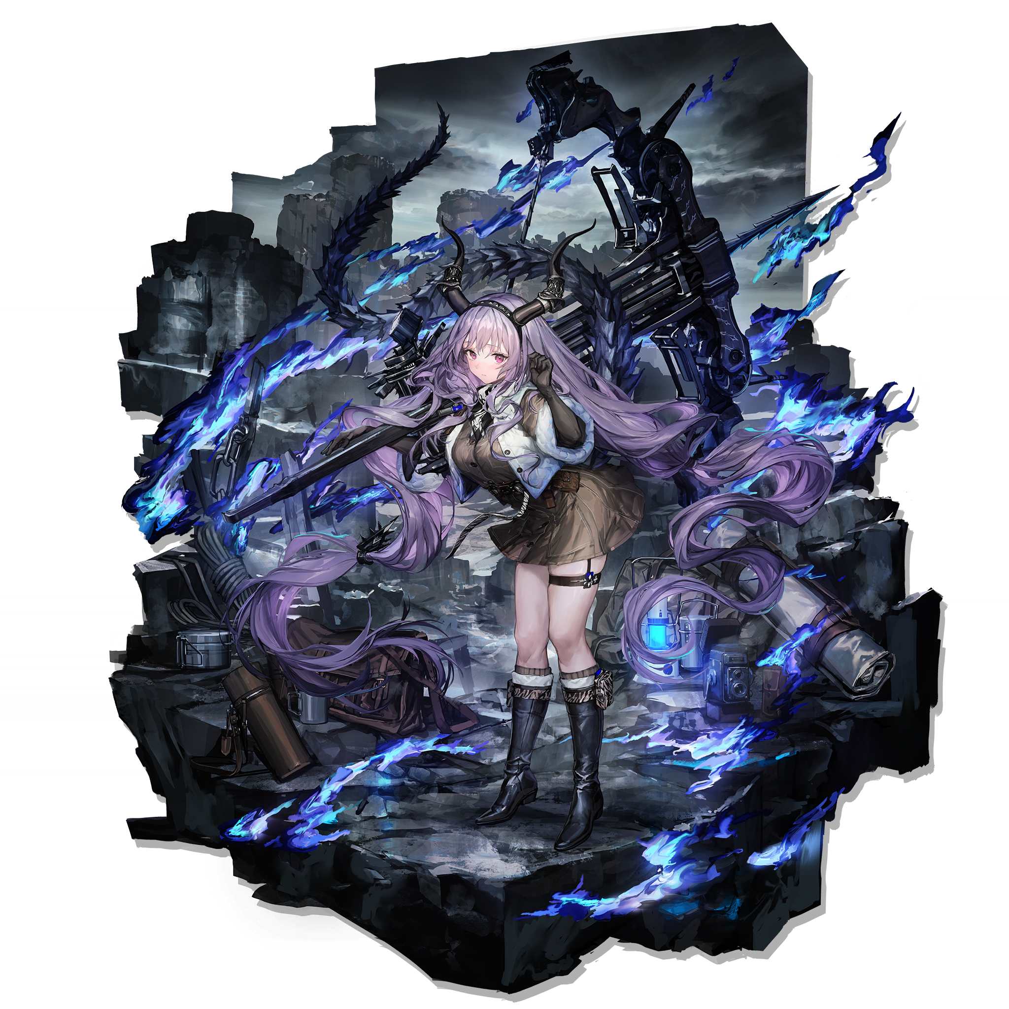 1girl :| arknights bag bedroll black_boots black_gloves black_hairband blue_fire blush boots bow_(weapon) brown_shirt brown_skirt buttons closed_mouth cloud cloudy_sky cropped_vest crossbow demon_girl demon_horns elbow_gloves electric_kettle fire floating_hair fur-trimmed_shirt fur_trim gloves hairband highres holding holding_crossbow holding_weapon horns kettle knee_boots leaning_forward legs_apart lm7_(op-center) long_hair long_sleeves looking_at_viewer low-tied_long_hair miniskirt official_alternate_costume official_art open_clothes open_vest outdoors pink_eyes pleated_skirt purple_hair shirt simple_background skindentation skirt sky solo thigh_strap thighs typhon_(arknights) typhon_(northern_pathfinder)_(arknights) very_long_hair vest watermark weapon white_background white_vest