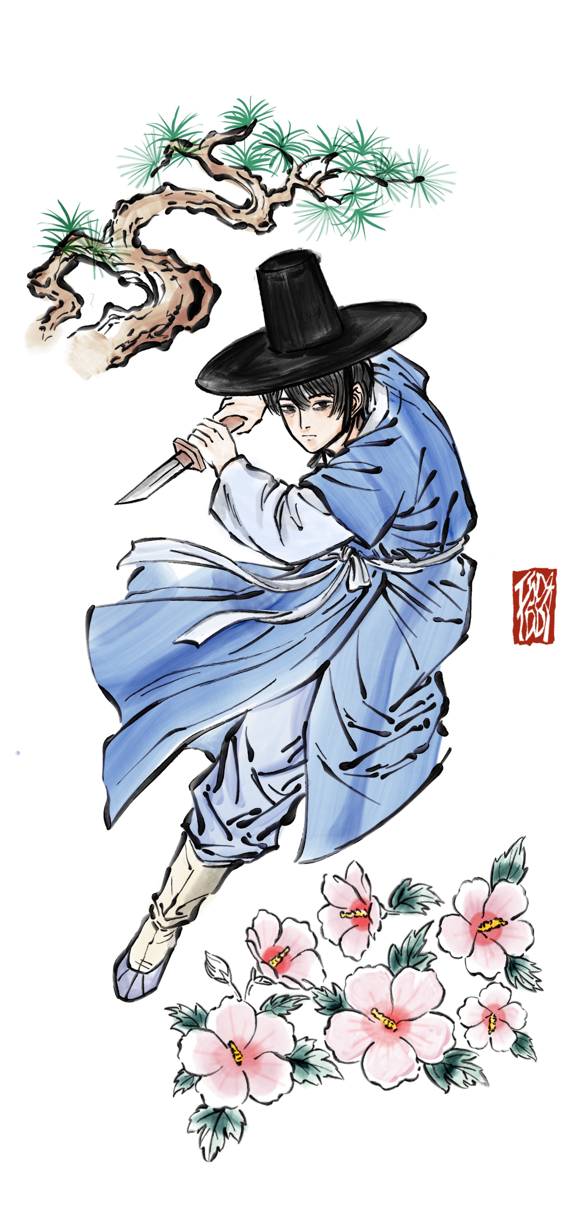 1boy absurdres alternate_costume black_hair black_hat blue_hanbok f5d4ddy flower full_body hanbok hat highres knife korean_clothes limbus_company looking_at_viewer male_focus pink_flower project_moon short_hair simple_background solo tree white_background yi_sang_(project_moon)