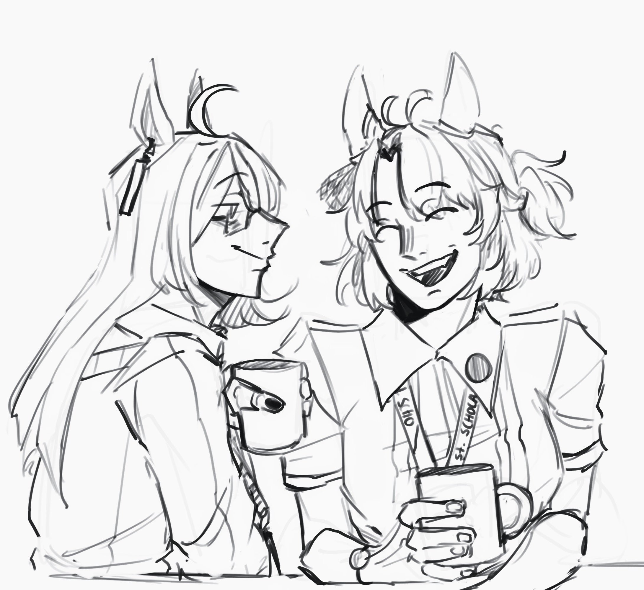 2girls animal_ears closed_eyes collared_shirt cup dantsu_flame_(umamusume) ear_ornament ear_tag earrings glasses hako_owo hand_up highres holding holding_cup horse_ears horse_girl jewelry lanyard manhattan_cafe_(umamusume) mug multiple_girls open_mouth shirt short_sleeves simple_background single_earring smile umamusume white_background