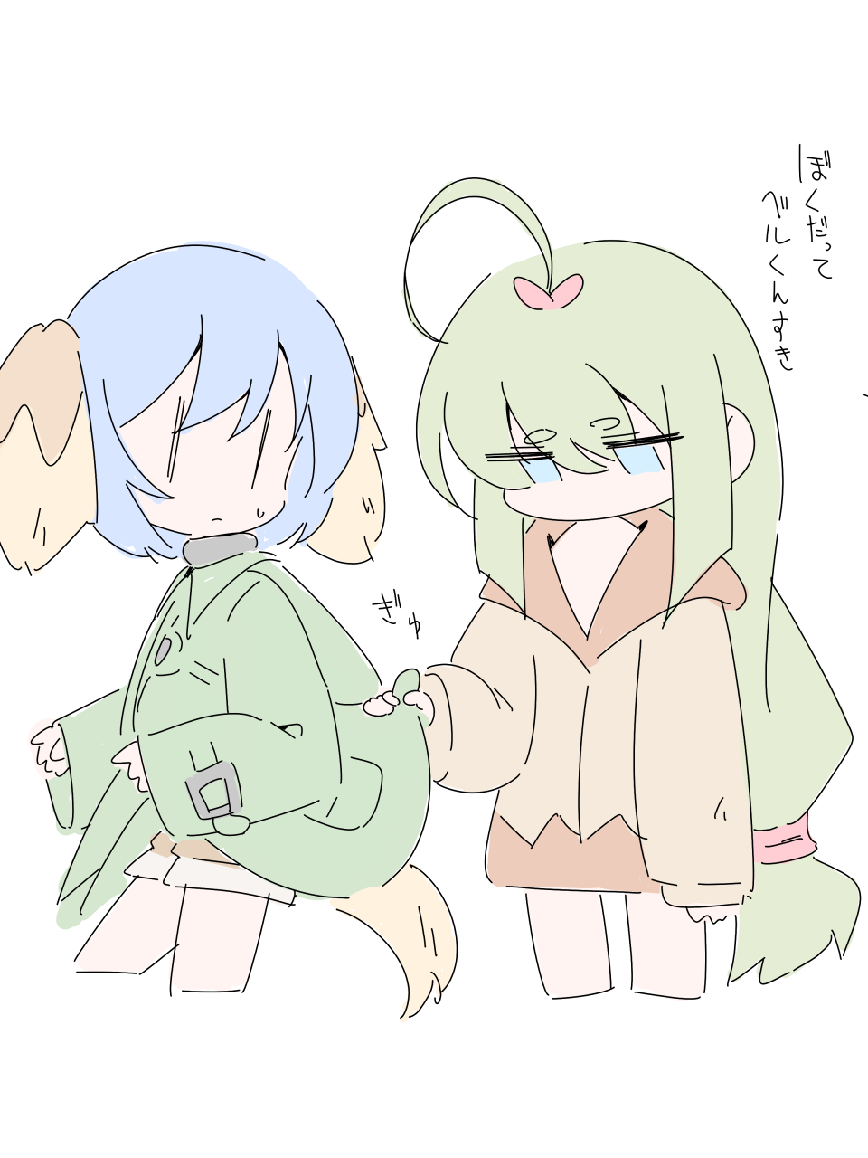 1boy 1girl animal_ears blue_eyes blue_hair cello_(20000) character_request coat dog_boy dog_ears dog_tail green_hair jacket japanese_text long_hair pulling_another's_clothes short_hair standing tail translation_request very_long_hair white_background